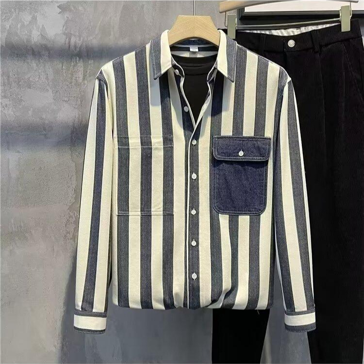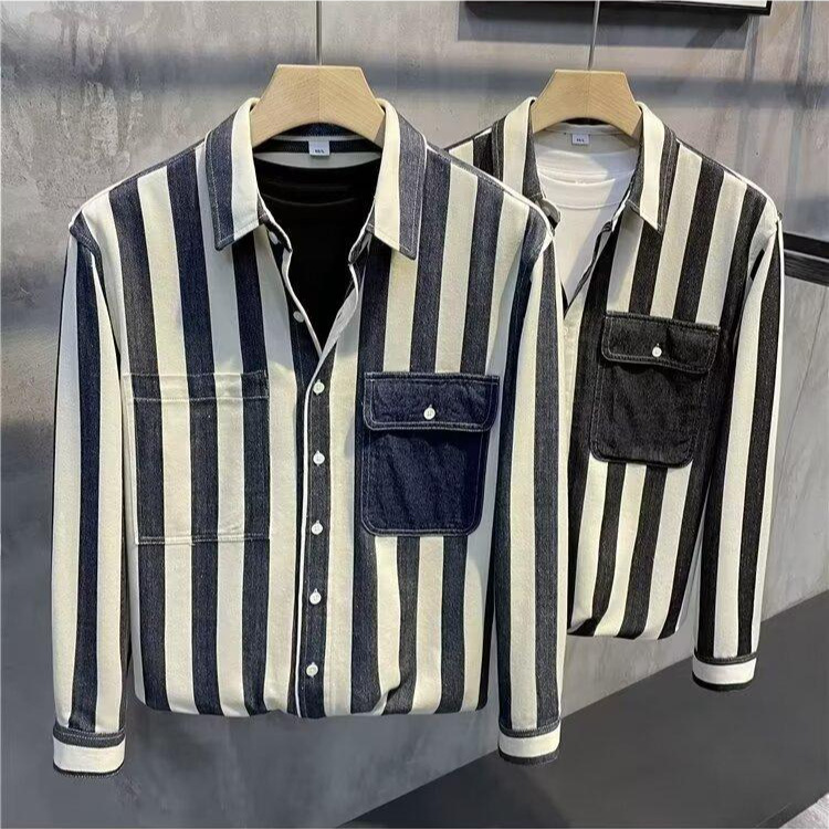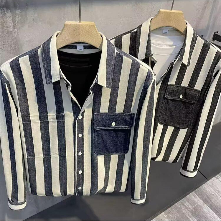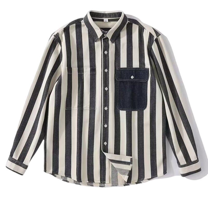 夏季新款条纹拼色长袖衬衫男士潮流时尚百搭休闲宽松翻领开衫上衣