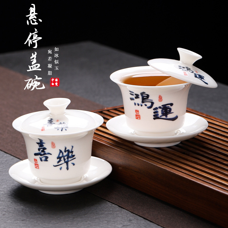羊脂玉瓷悬停三才盖碗简约白瓷泡茶碗不烫手单个带盖旋转敬茶碗