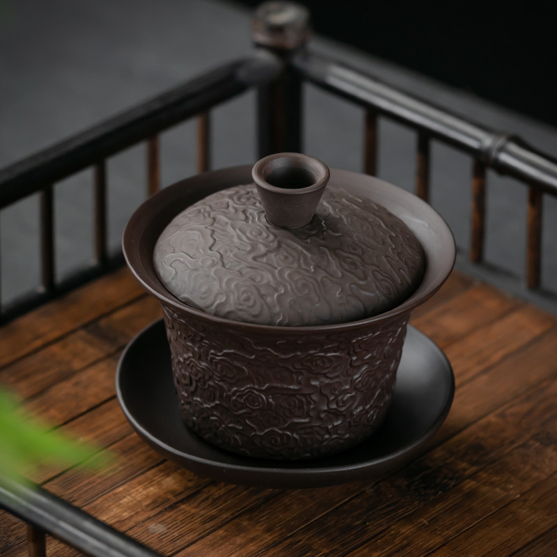 紫砂浮雕祥云盖碗品茗杯茶盏茶漏茶宠功夫茶具
