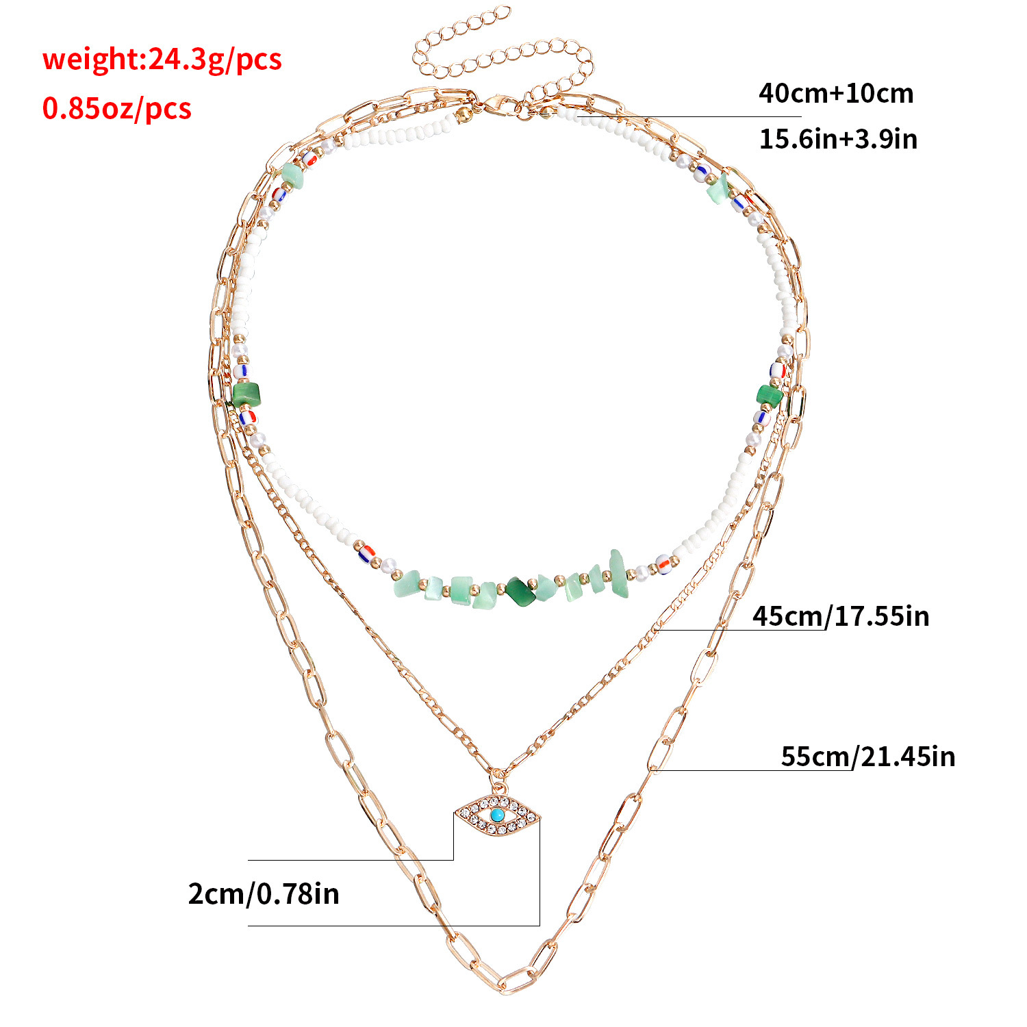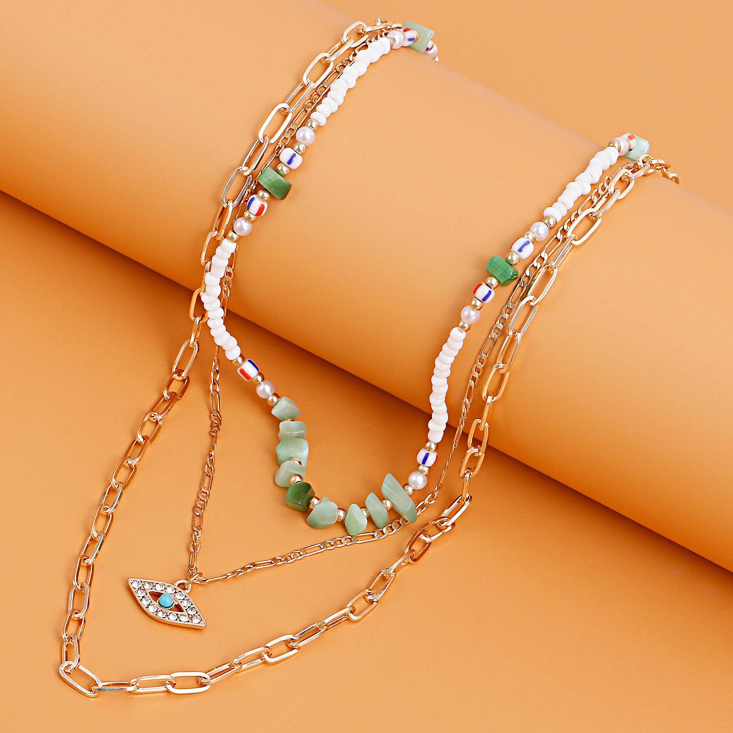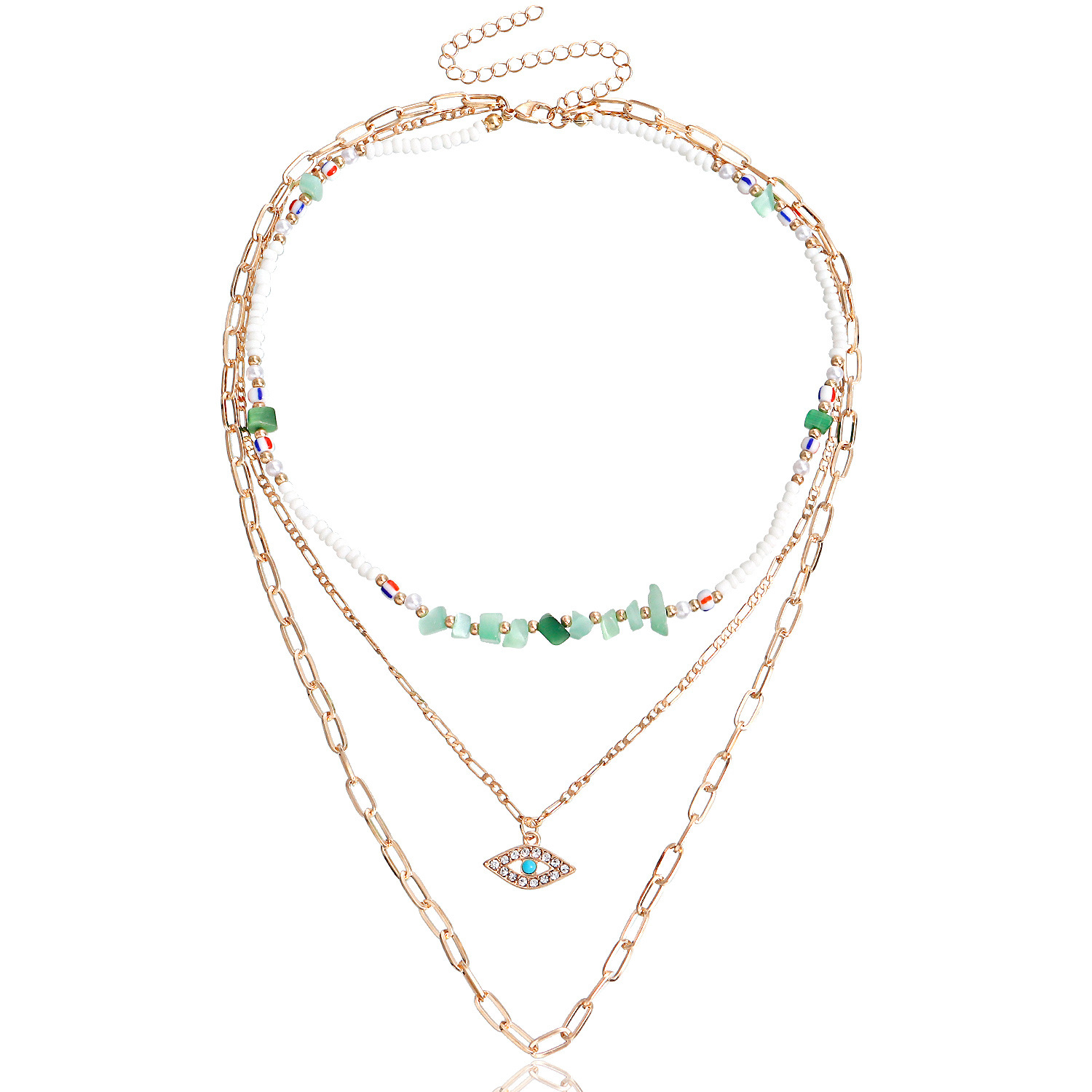 潮流多层白色米珠绿松石微镶钻恶魔之眼吊坠项链女