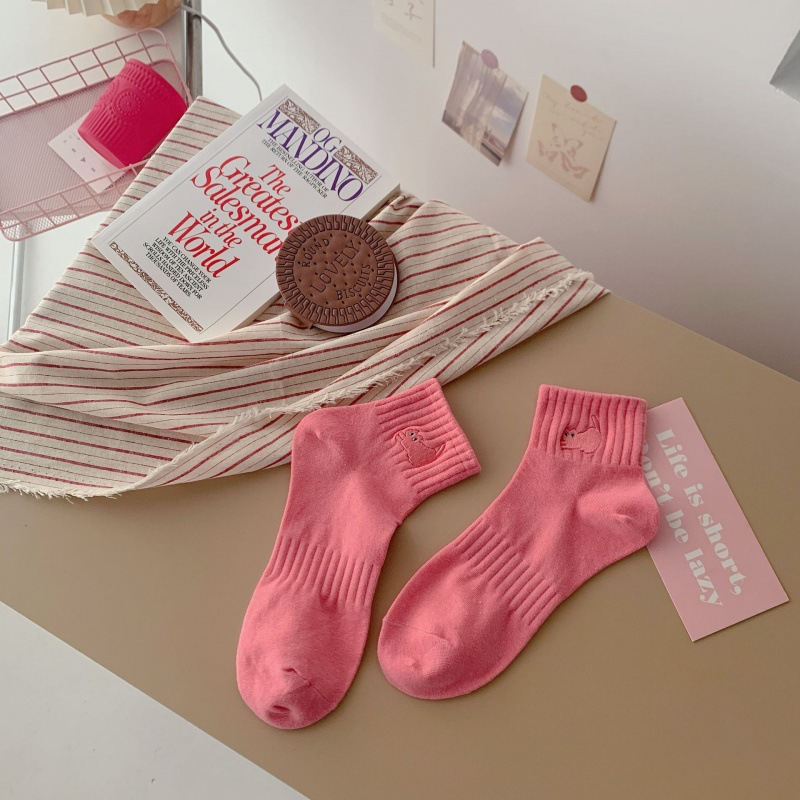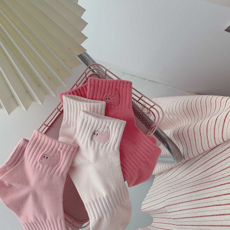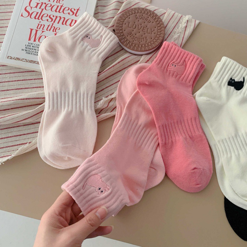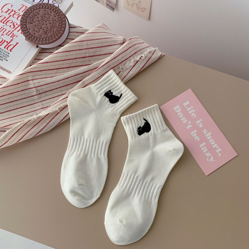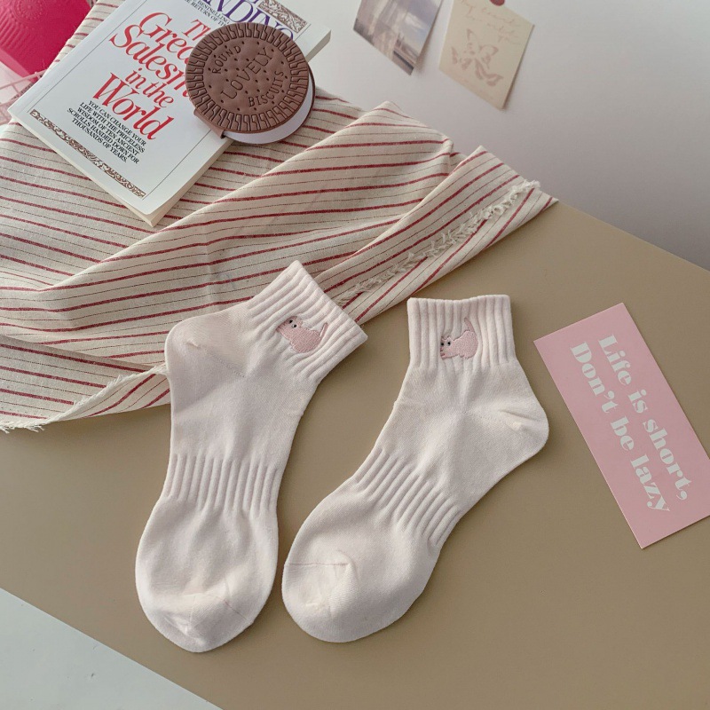 春季新品刺绣猫咪袜子学院风纯色休闲百搭ins风棉质短筒男女袜