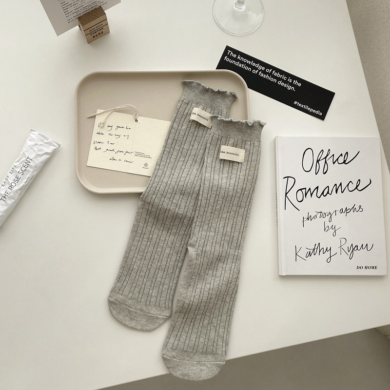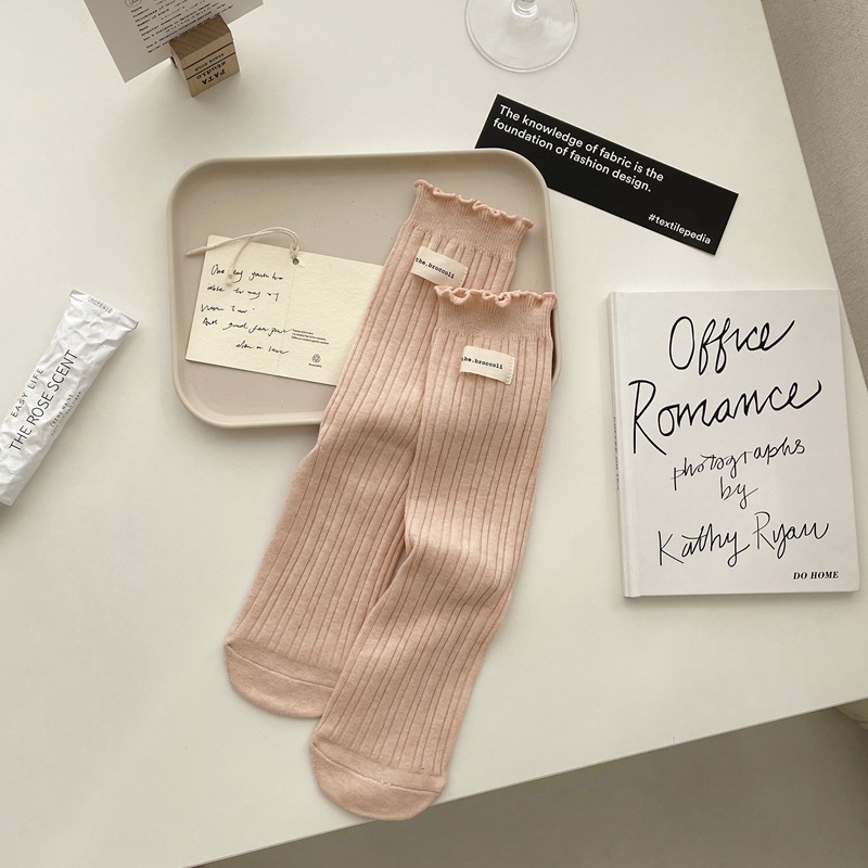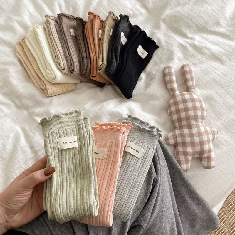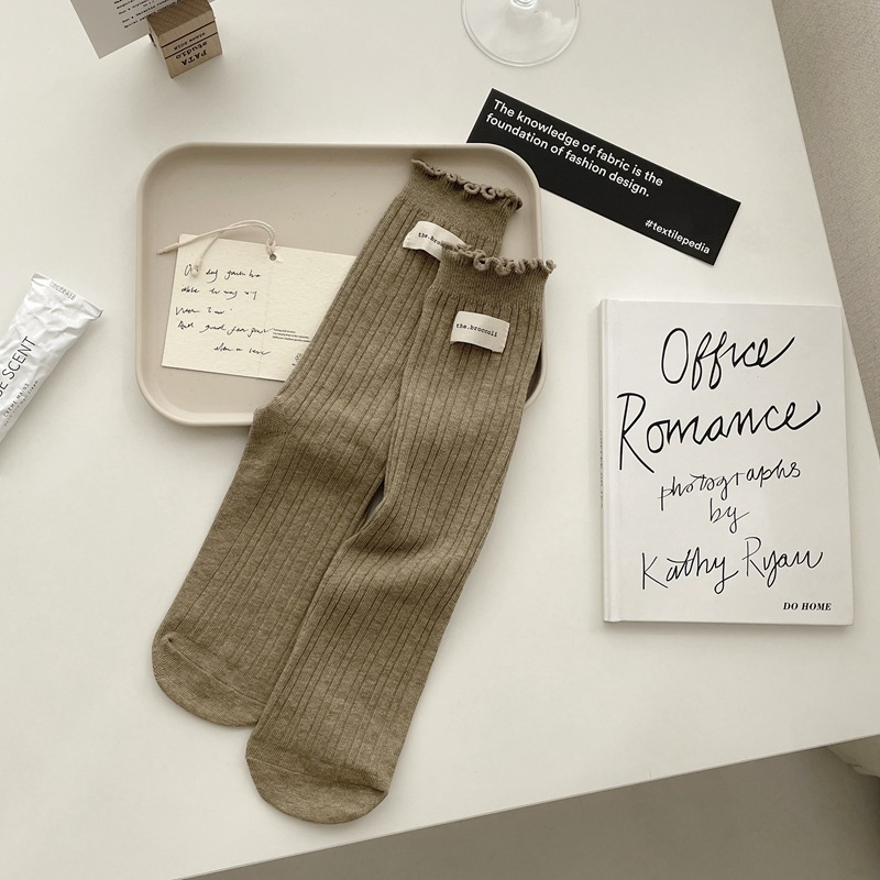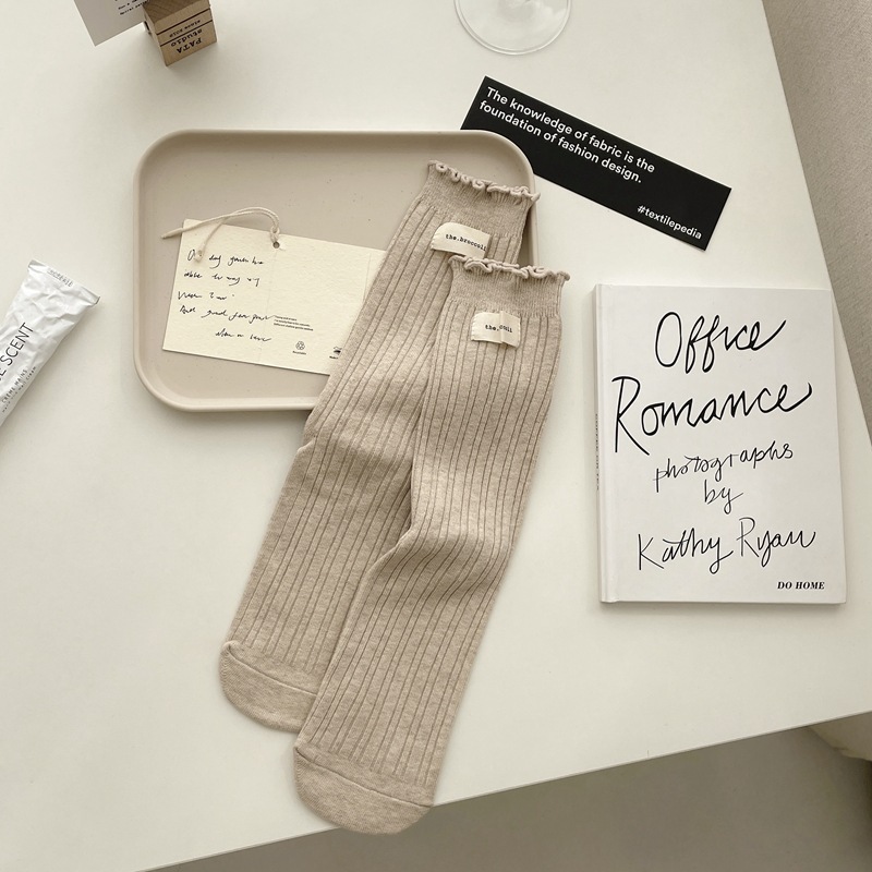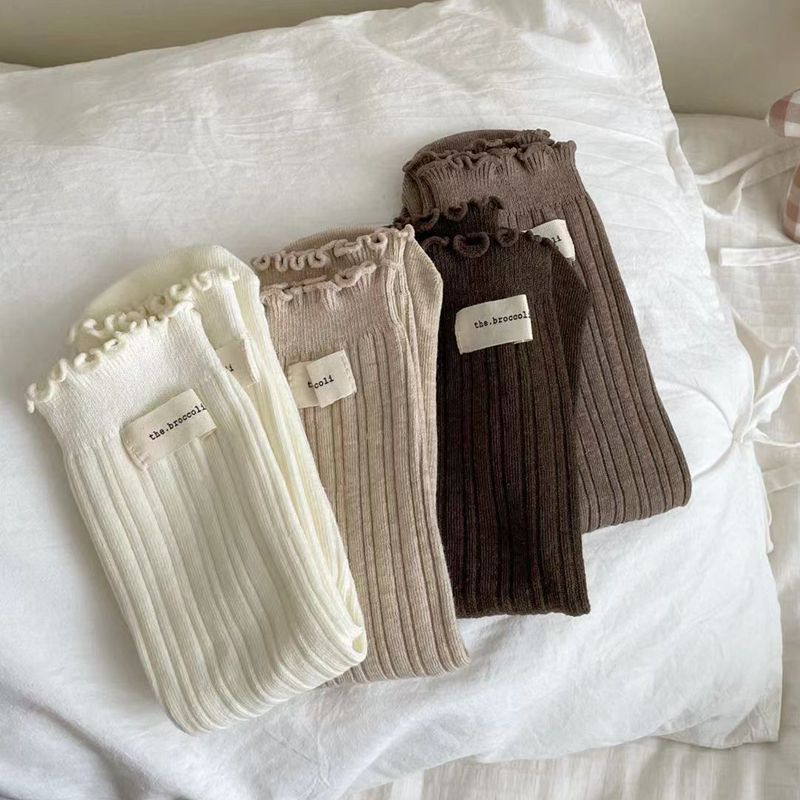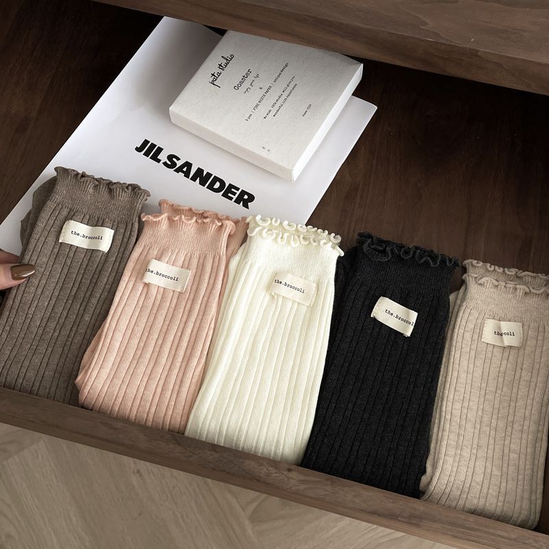 春秋新款ins同款纯色中筒堆堆木耳边布标美拉德色韩系女袜