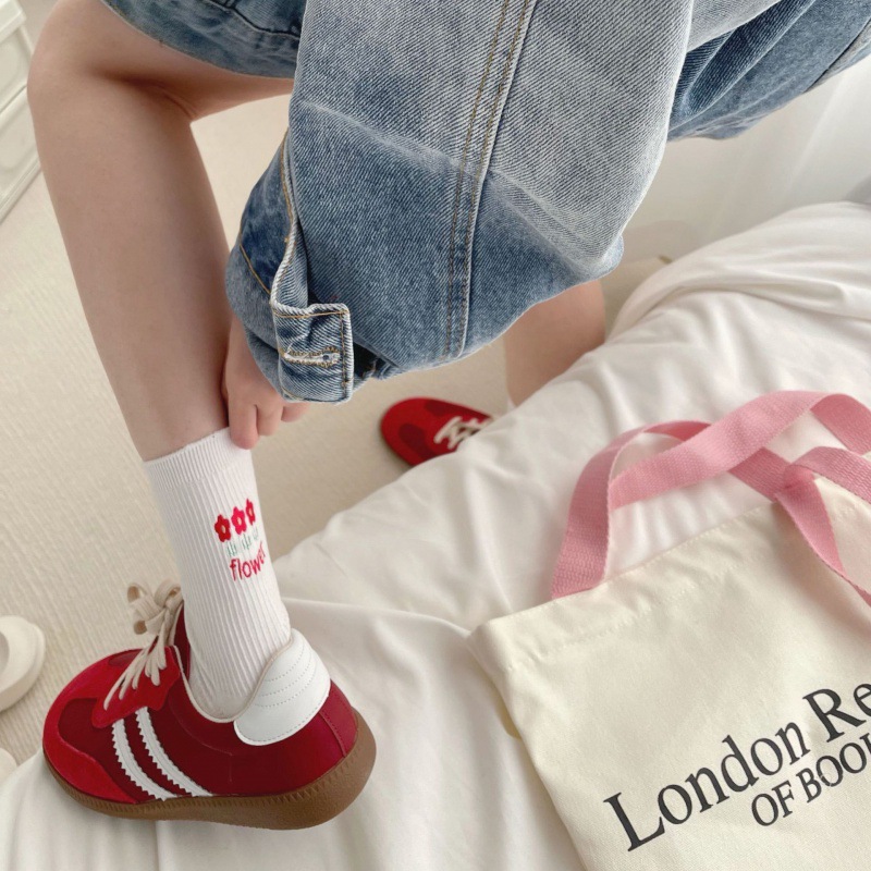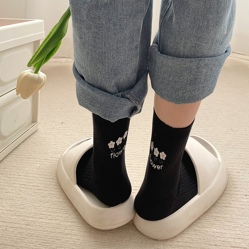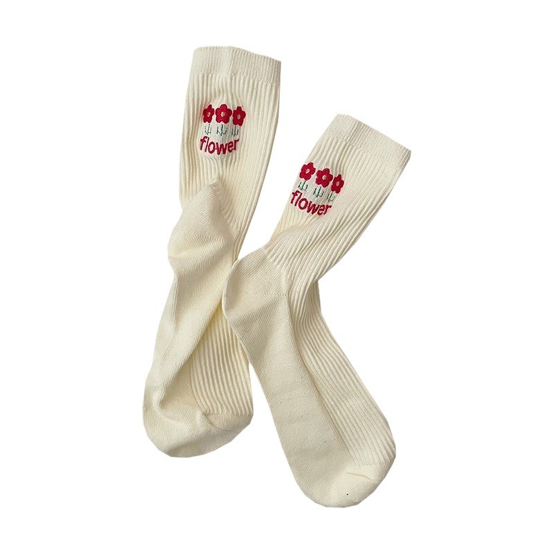 双针花朵刺绣袜子可爱兔子女袜纯棉中筒袜ins日系男女韩版堆堆袜