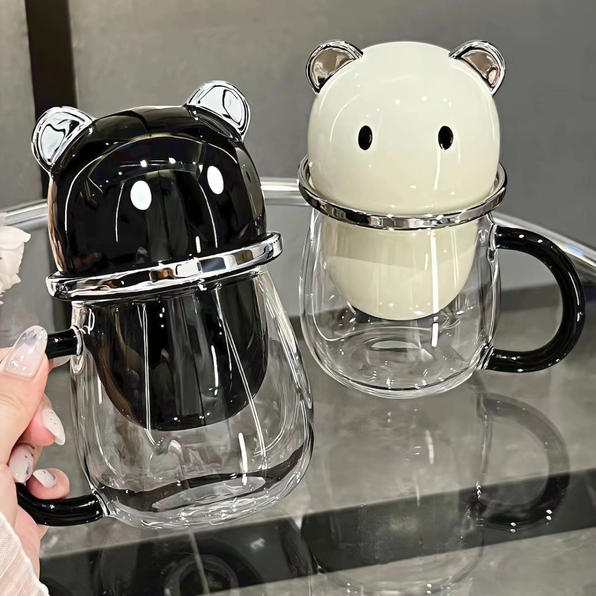 高颜值旋转式陶瓷高硼硅易清洁茶水分离水杯多功能办公室小熊养生