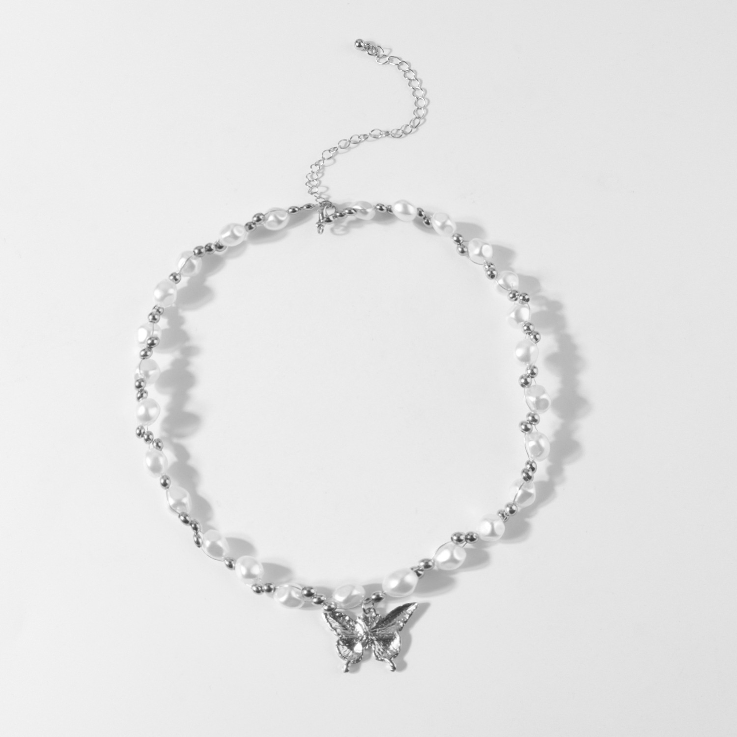 欧美跨境饰品 时尚浮雕立体蝴蝶项链女 短款气质珍珠几何单层项饰