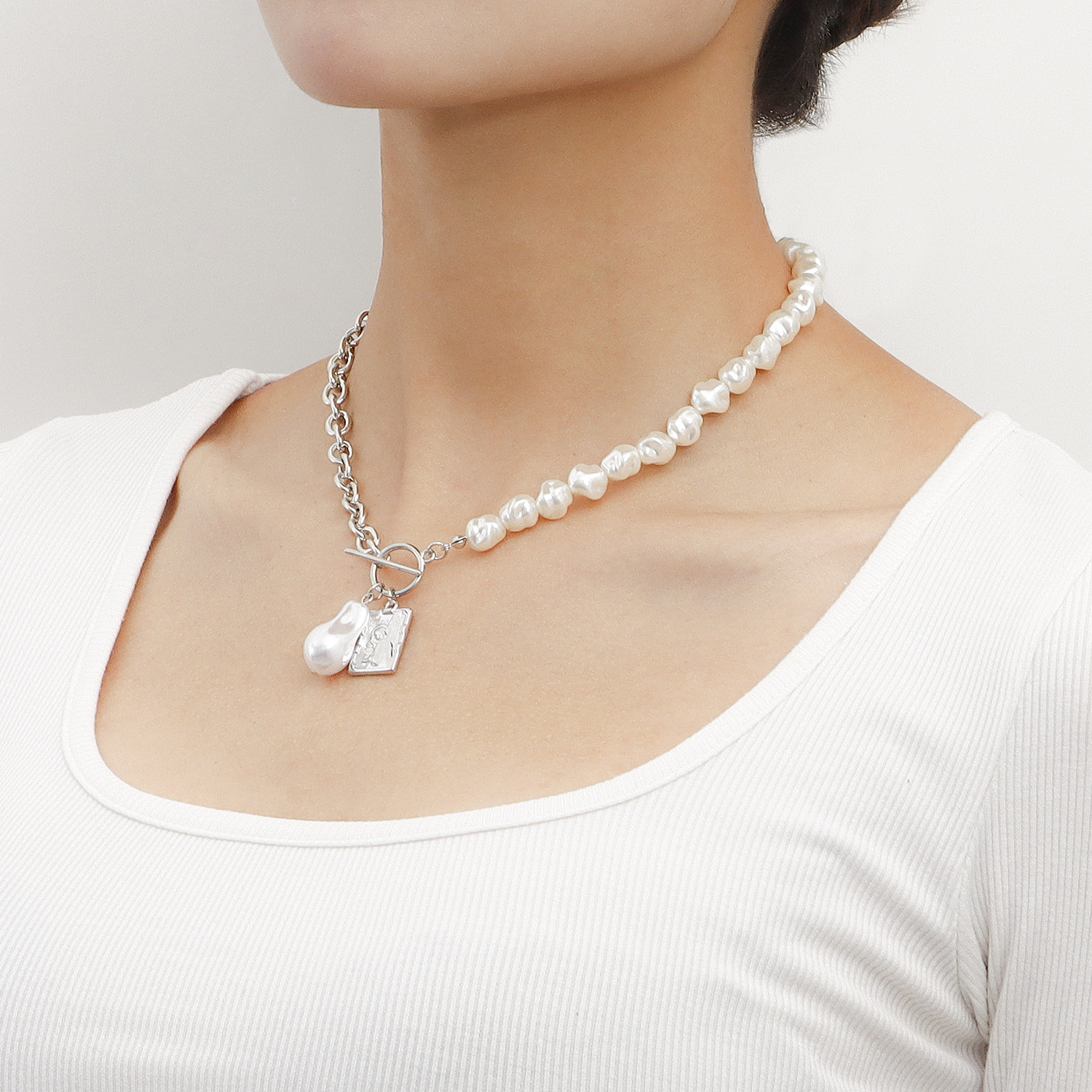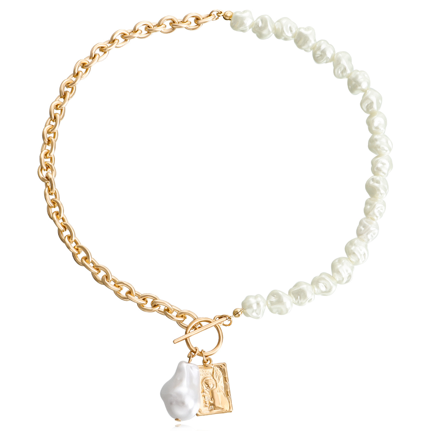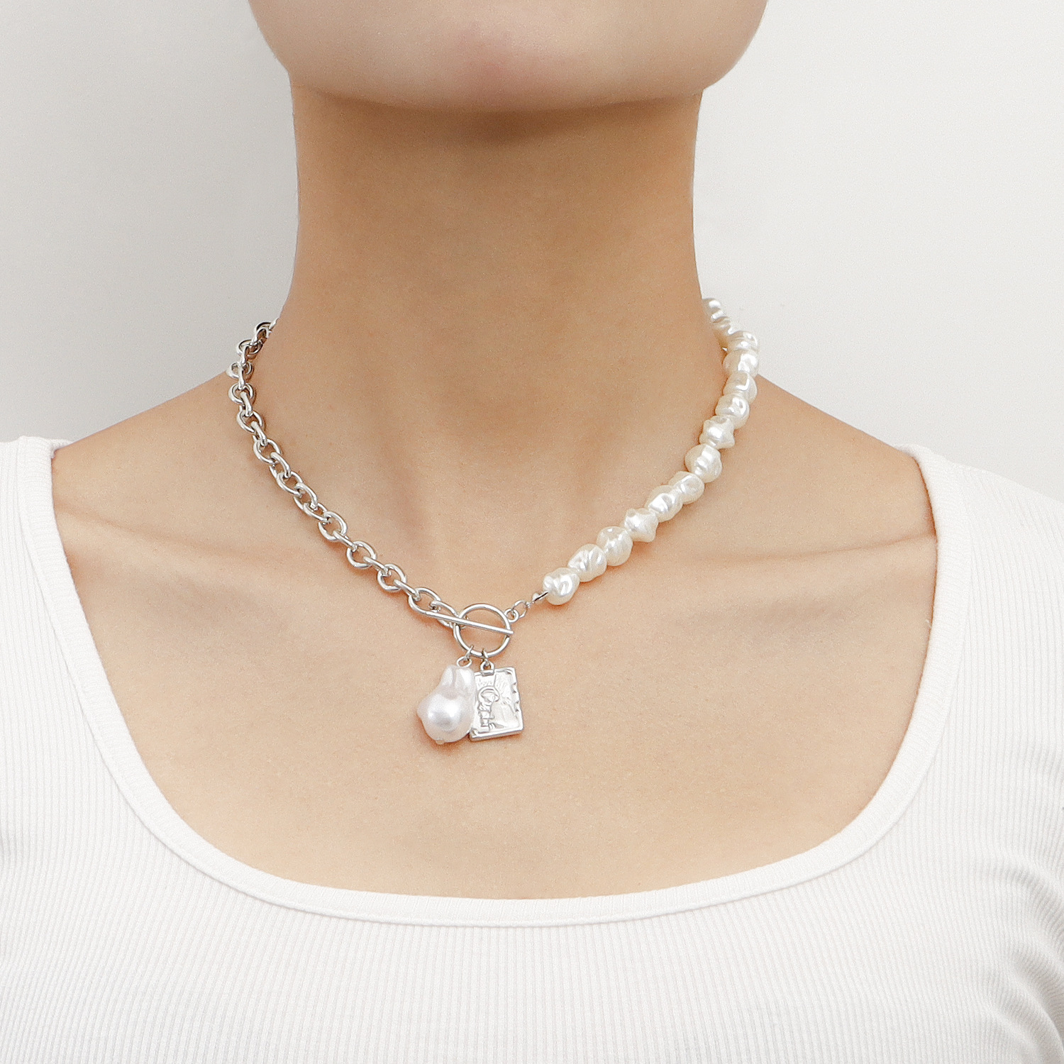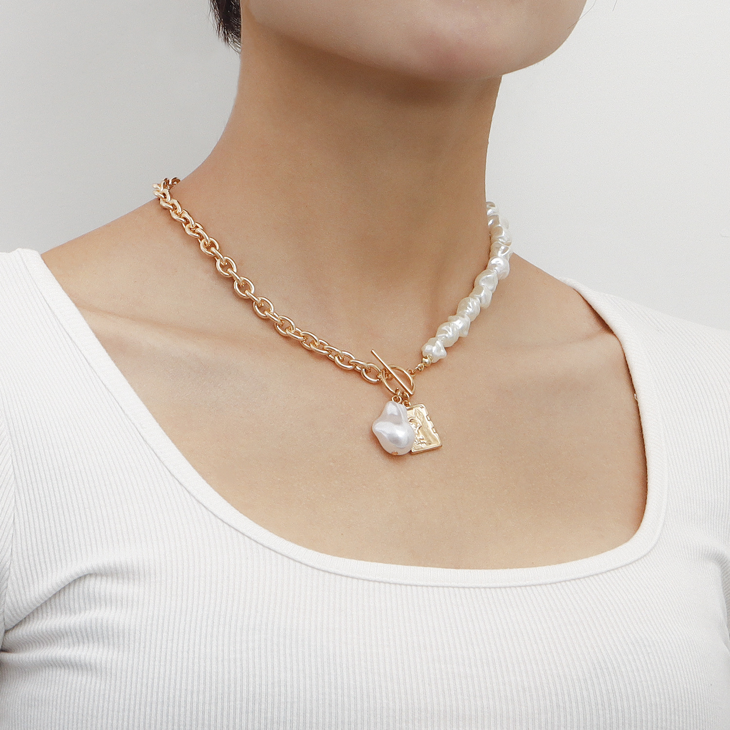 欧美跨境饰品 亚克力异形珍珠拼接粗链方形圆牌项链女 冷淡风项饰
