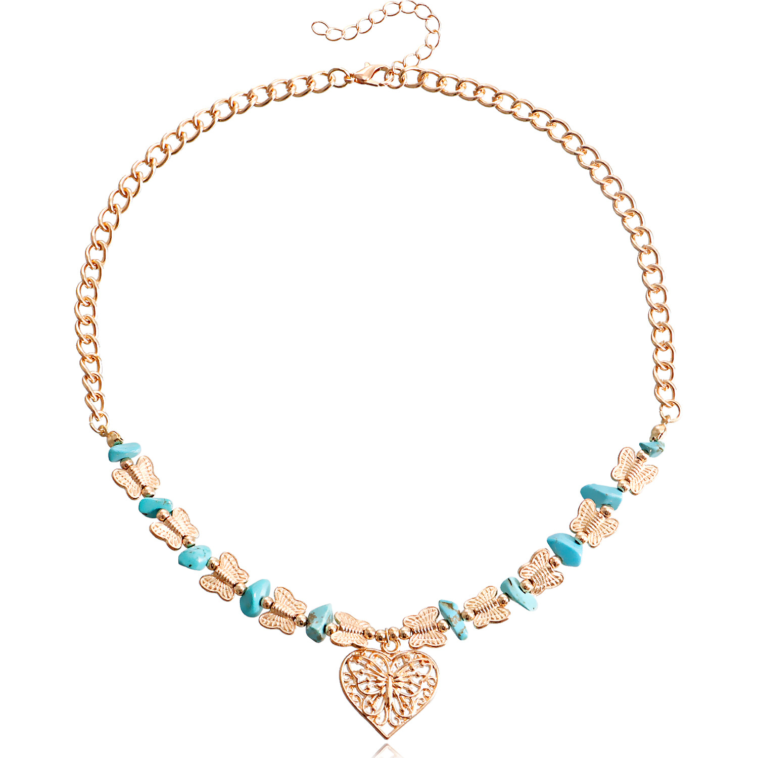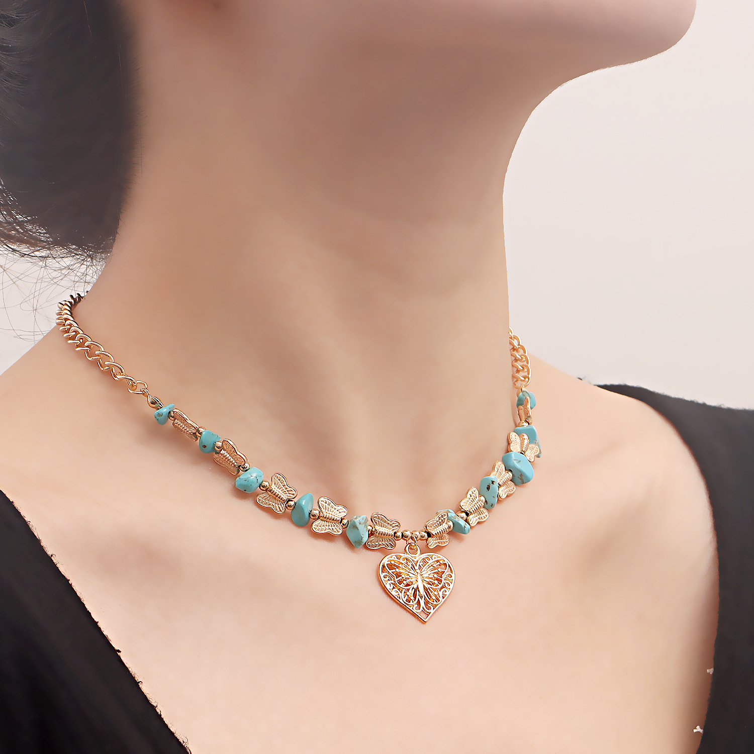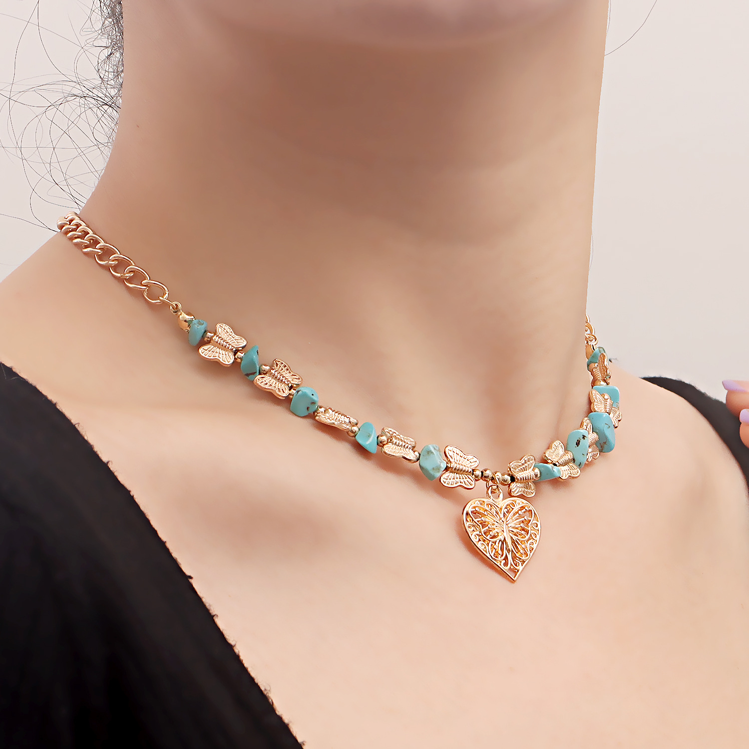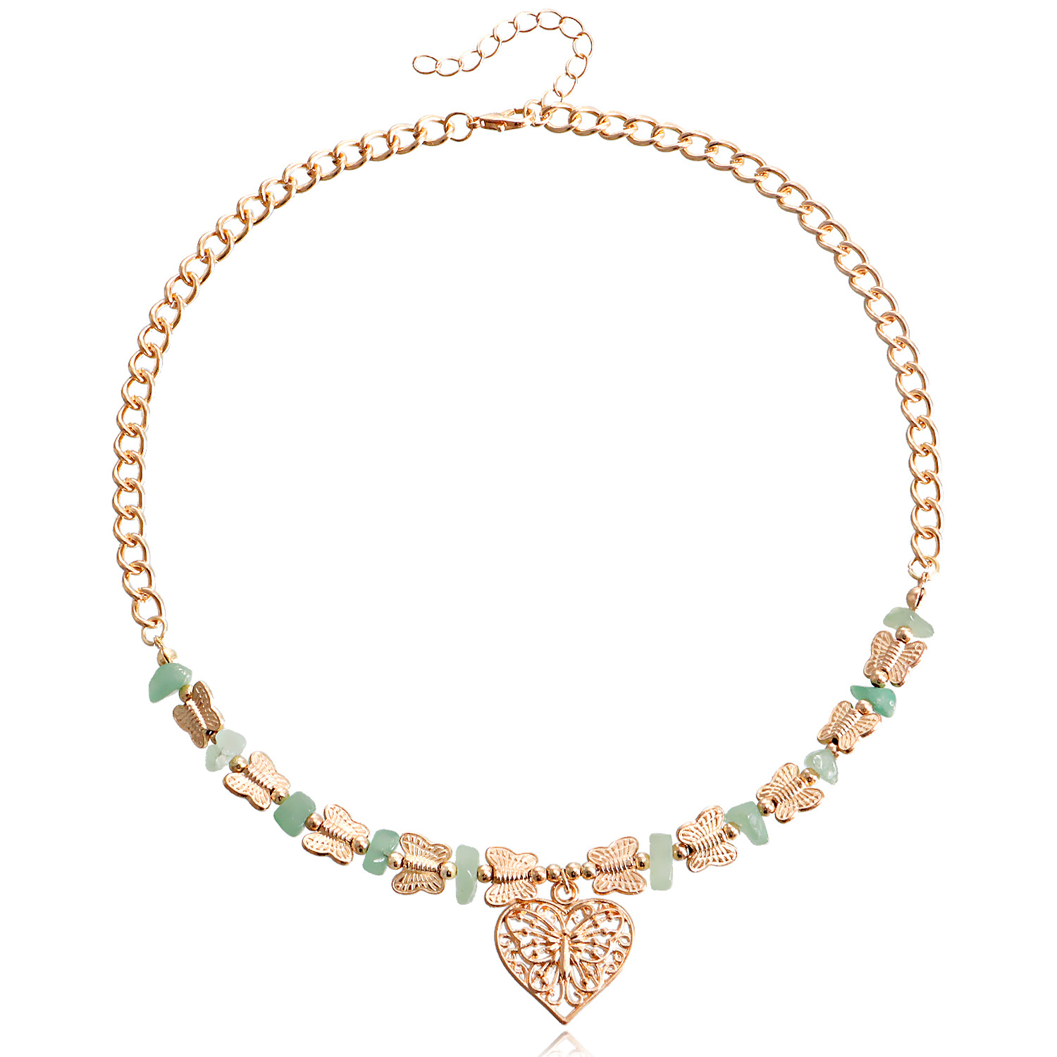 欧美跨境饰品 热销天然石蝴蝶拼接碎石锁骨链项饰 复古爱心项链女