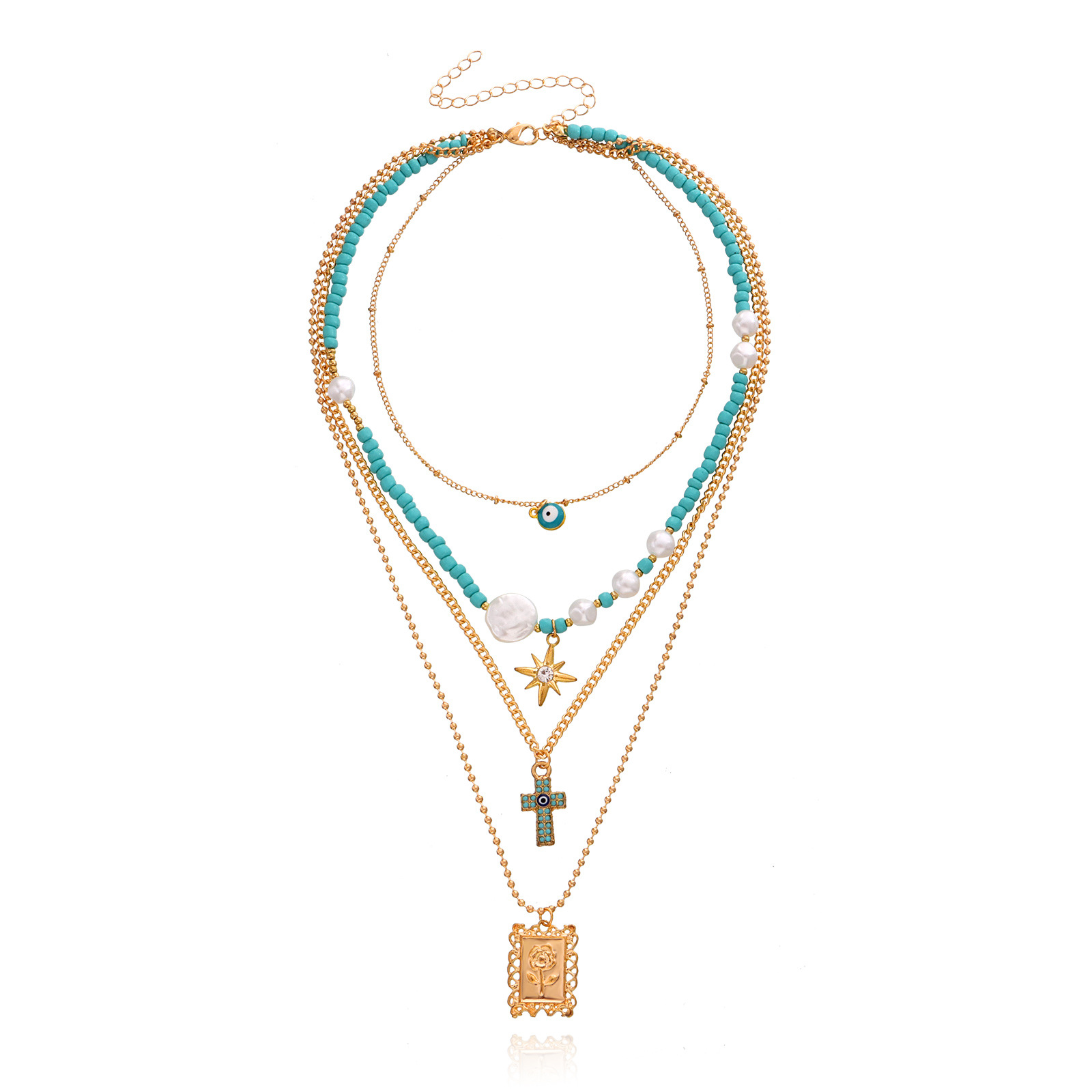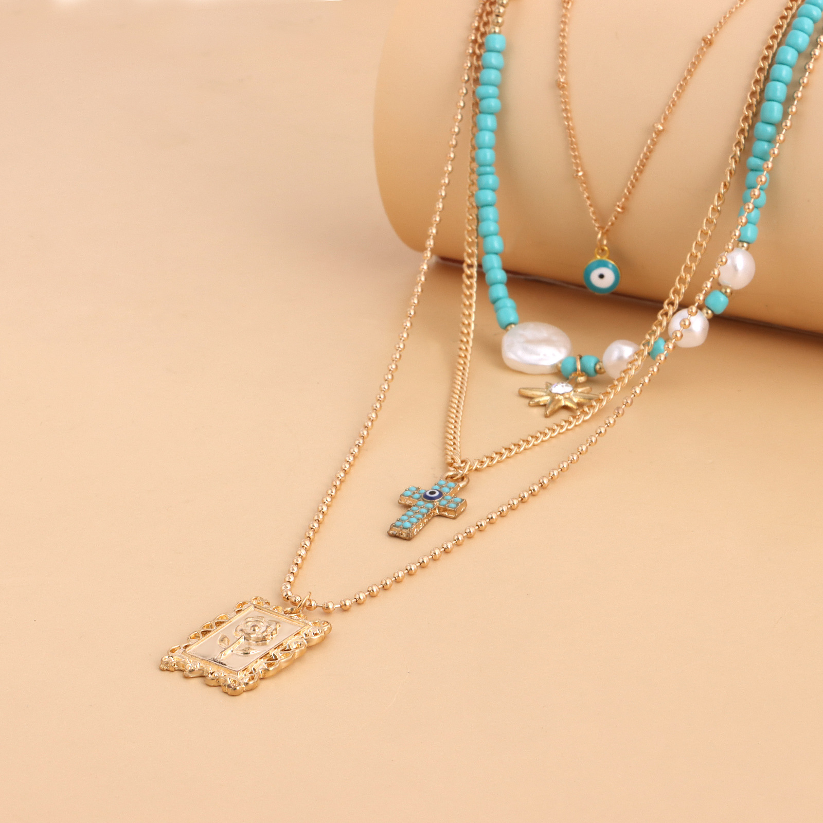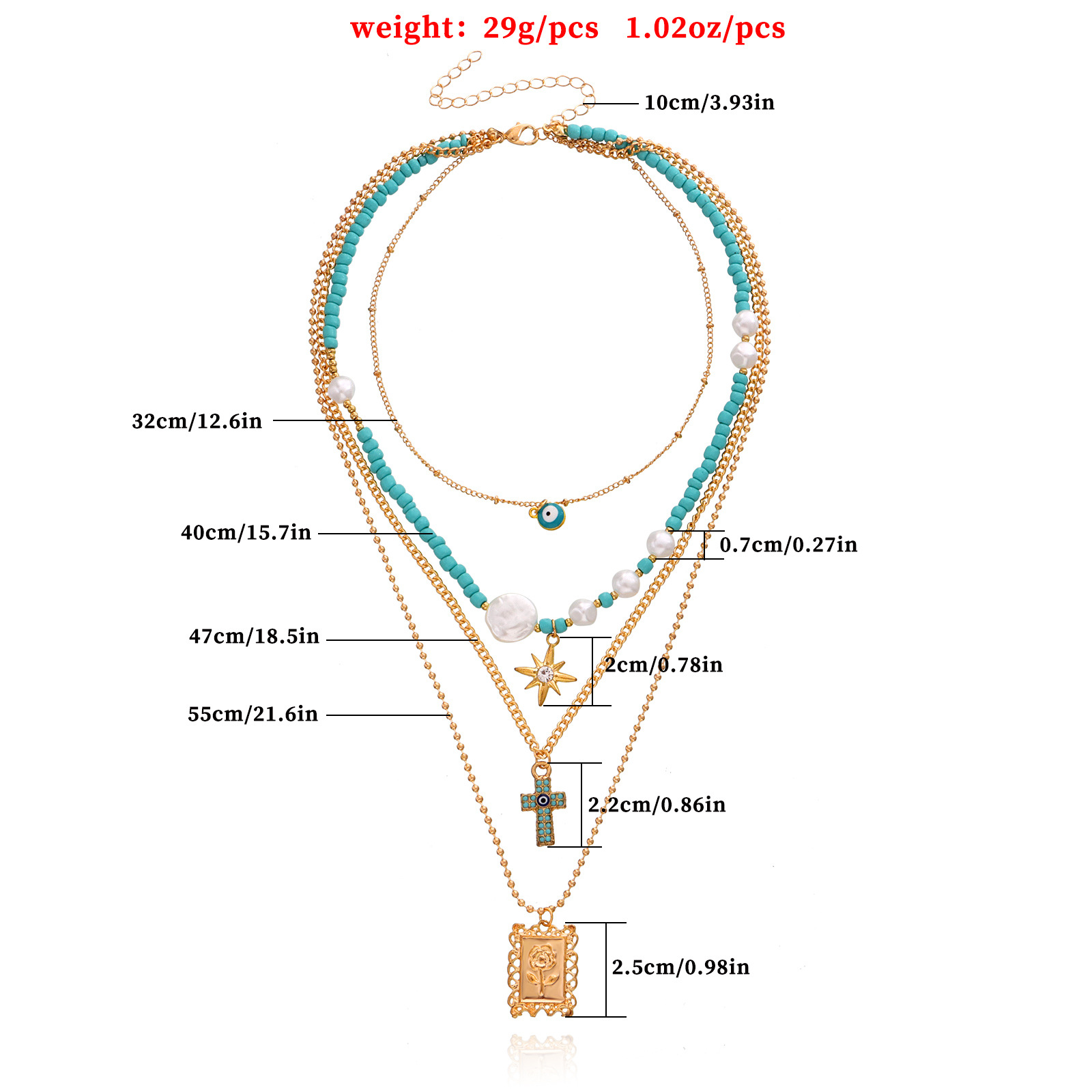 欧美跨境饰品 波西米亚时尚多层蓝色眼睛玫瑰花十字架吊坠项链女