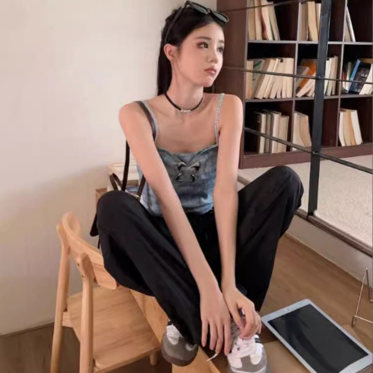 蓝色扎染吊带小背心女夏季甜辣妹蝴蝶结复古外穿内搭露背短款上衣