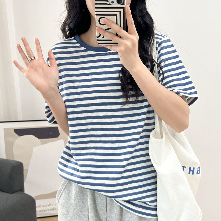 竹节棉条纹短袖t恤女ins潮女夏季纯棉宽松打底上衣宽松体恤衫