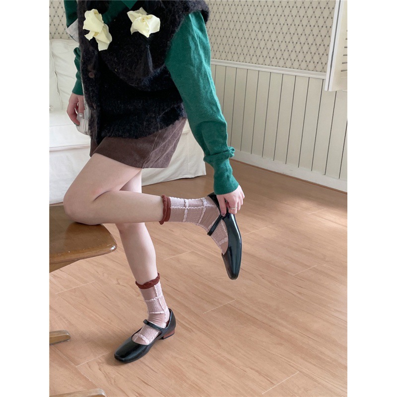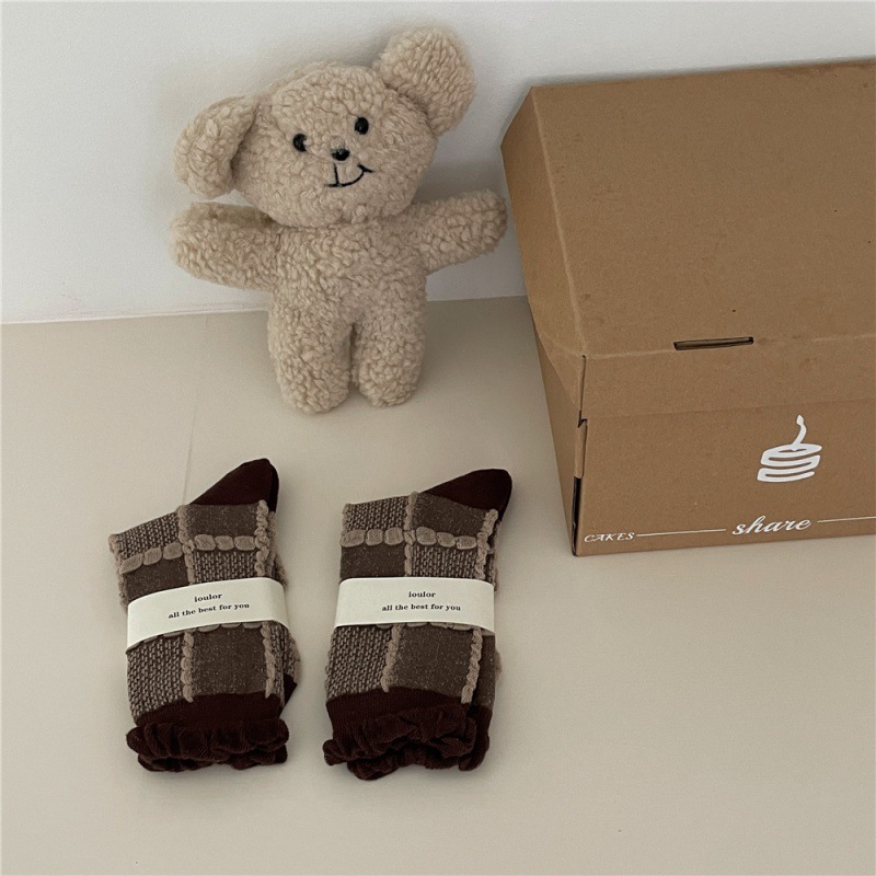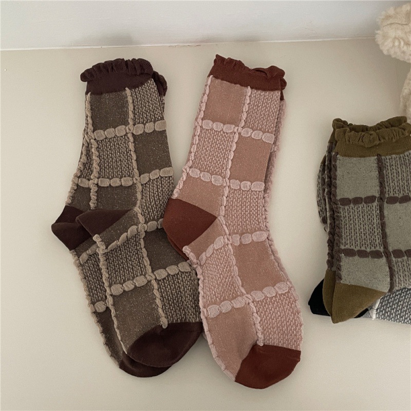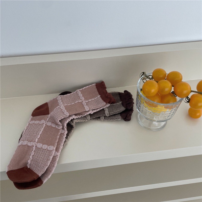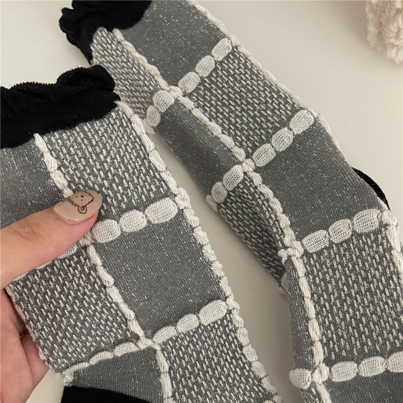 浮雕小众秋冬新款复古格子女袜泡泡花边袜口堆堆袜甜美中筒袜jk袜