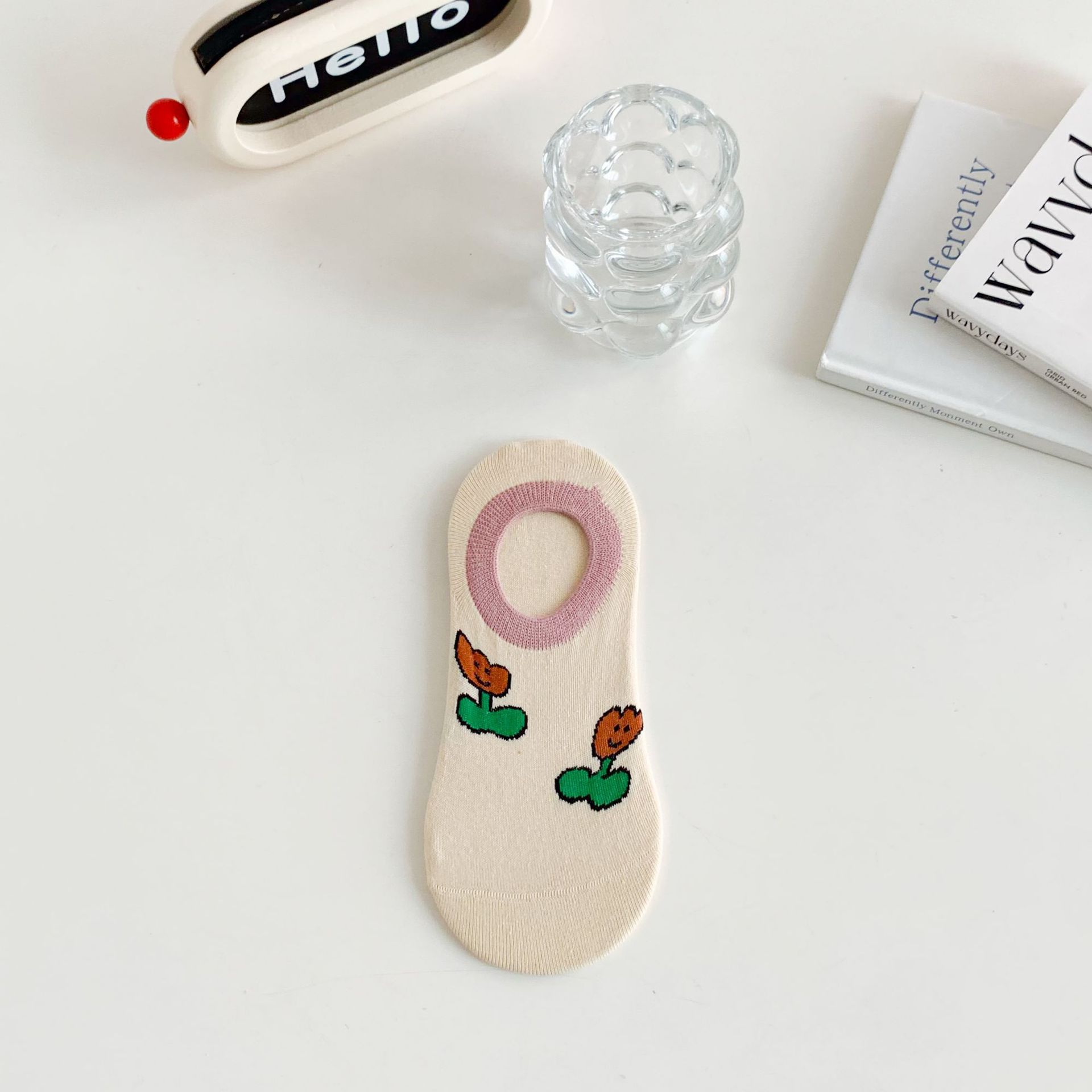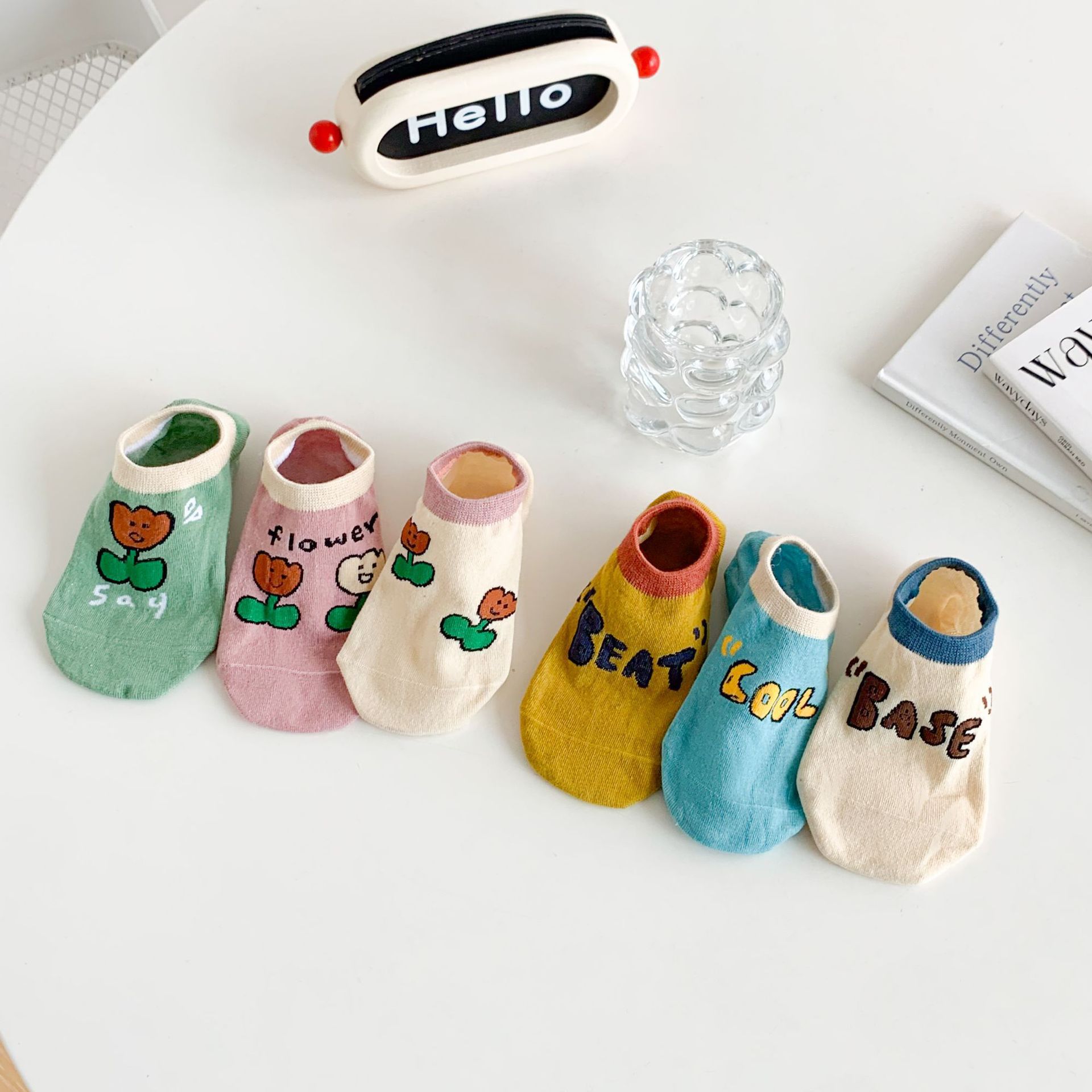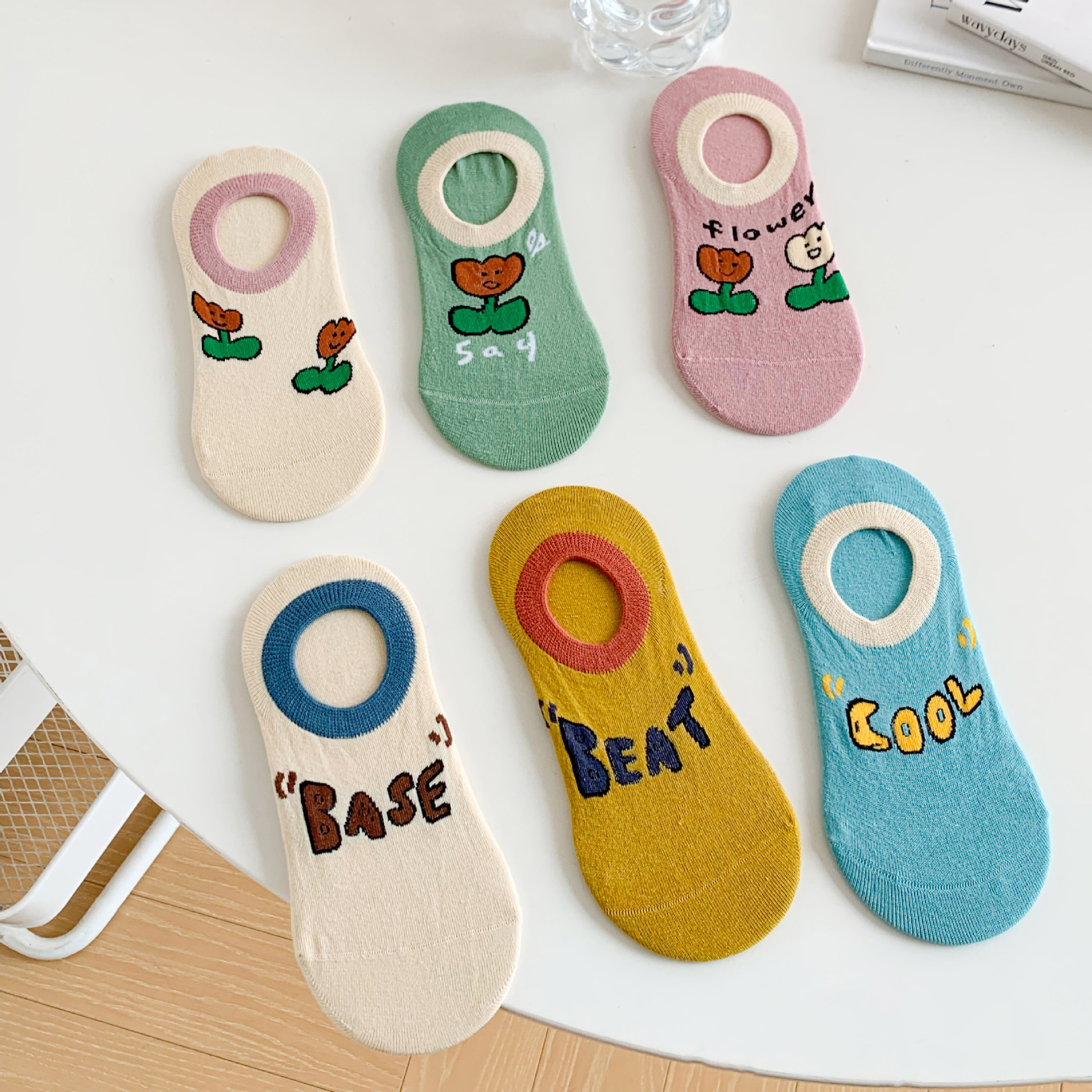 郁金香花朵船袜女~拼色少女后跟防滑点胶隐形袜字母短袜无骨潮袜