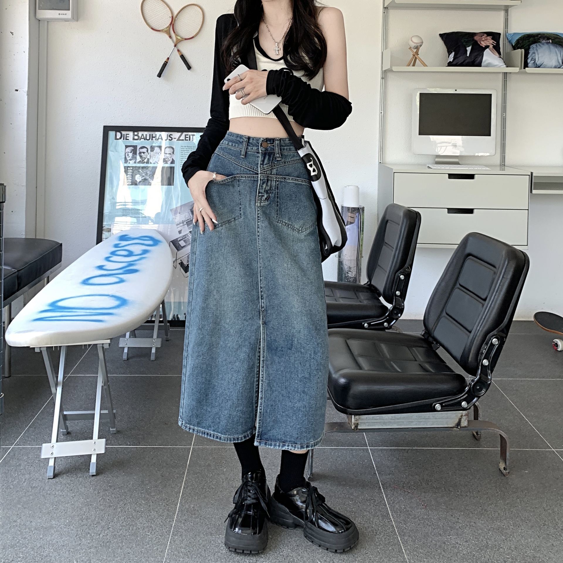 春季新款小个子高街风复古高腰显瘦A字半身裙女开叉中长裙子