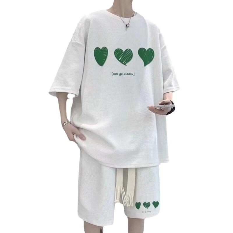 夏季日系爱心套头短袖男秋季慵懒风时尚个性印花上衣港风情侣套装