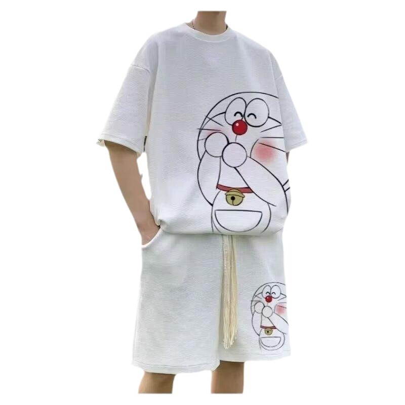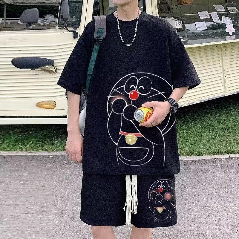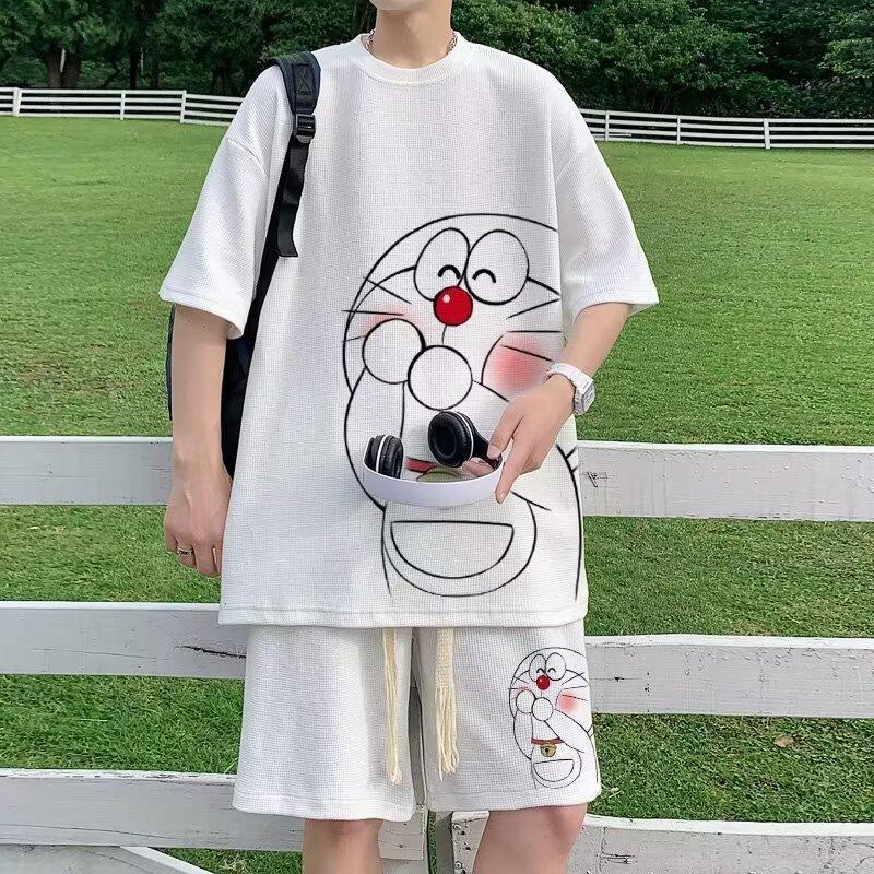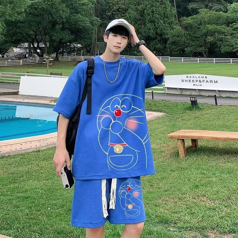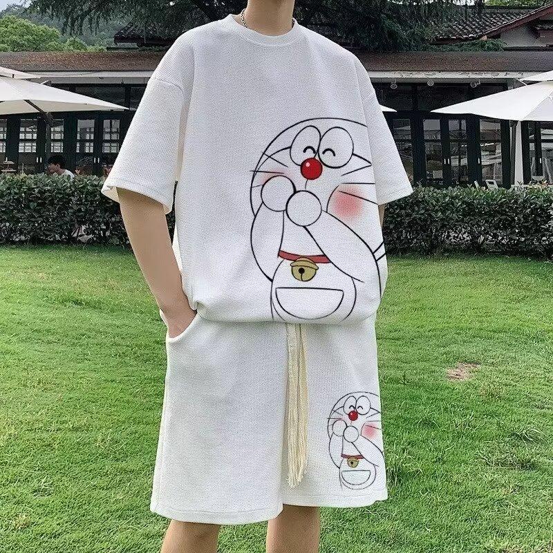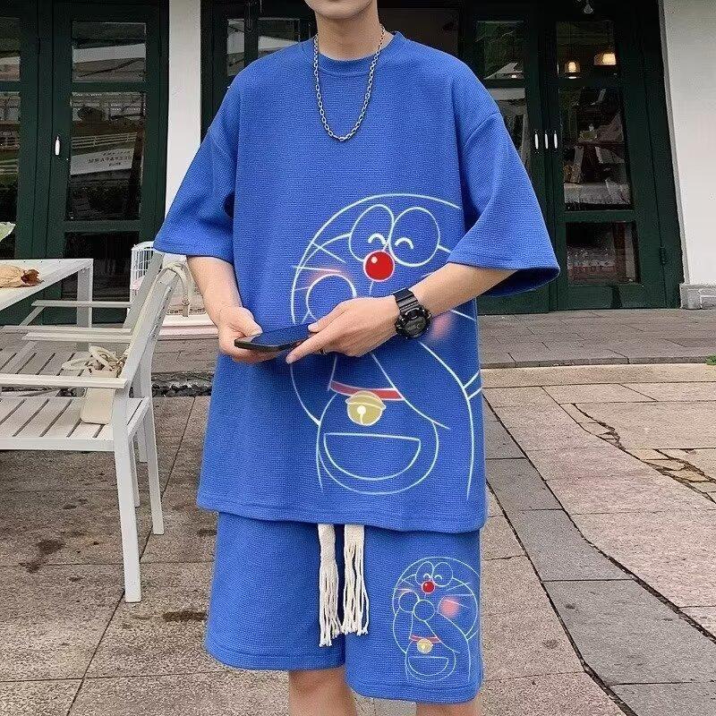 华夫格情侣装哆啦A梦T恤短裤两件套宽松大码休闲运动套装高街潮男