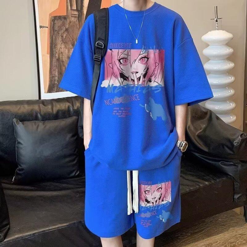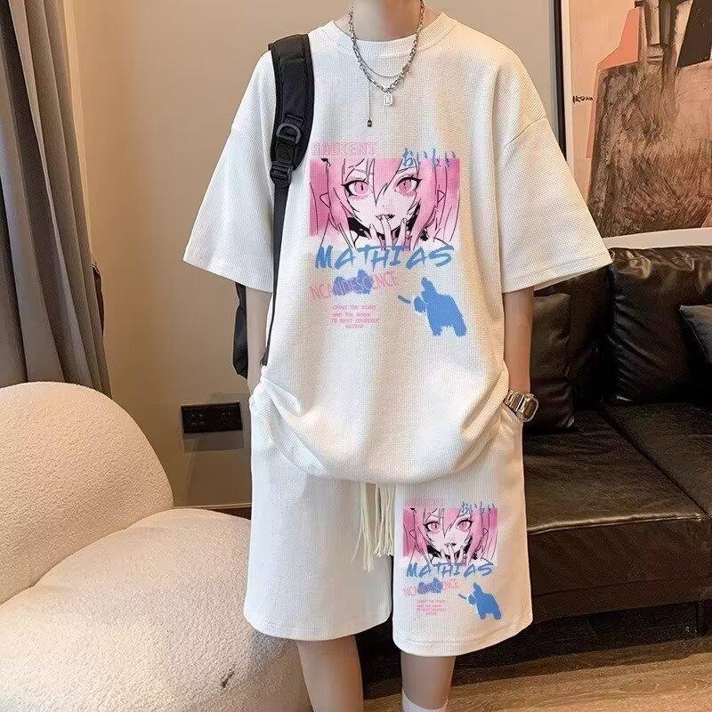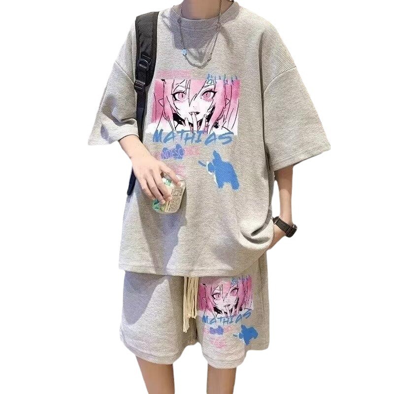 卡通动漫t恤男嘻哈短袖夏季宽松五分袖潮流潮牌ins男生原宿风套装