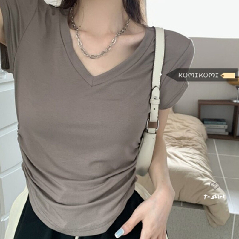 螺纹辣妹灰色不规则V领正肩短袖T恤夏季设计感修身短款上衣女