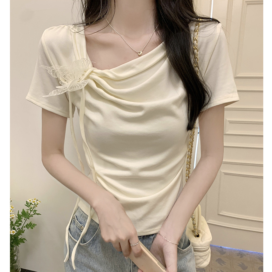 不规则设计感蝴蝶结抽褶短袖t恤女2025新款夏季修身短款体恤上衣
