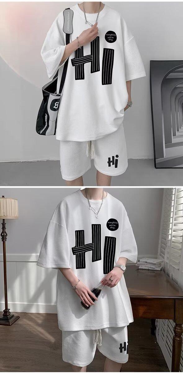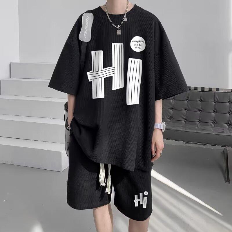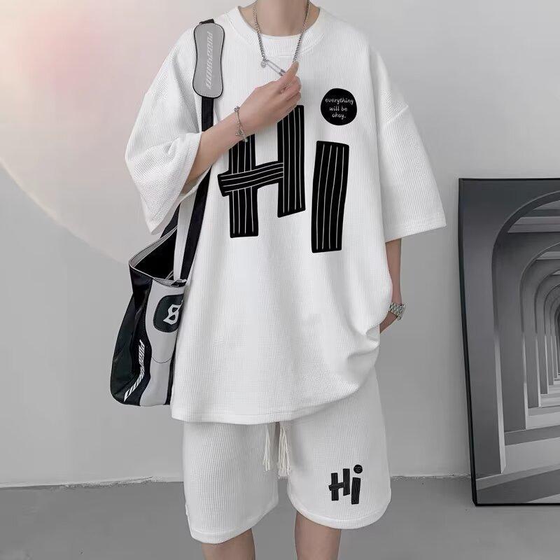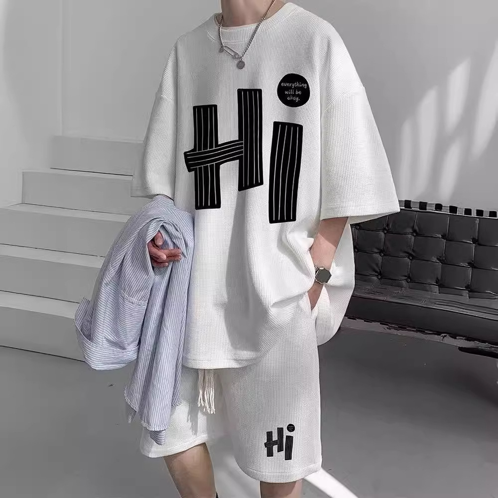 华夫格短袖套装男生潮牌夏季宽松休闲五分短裤运动搭配帅气一套装