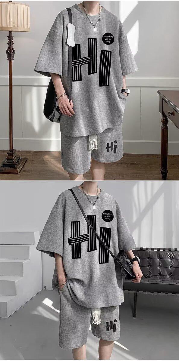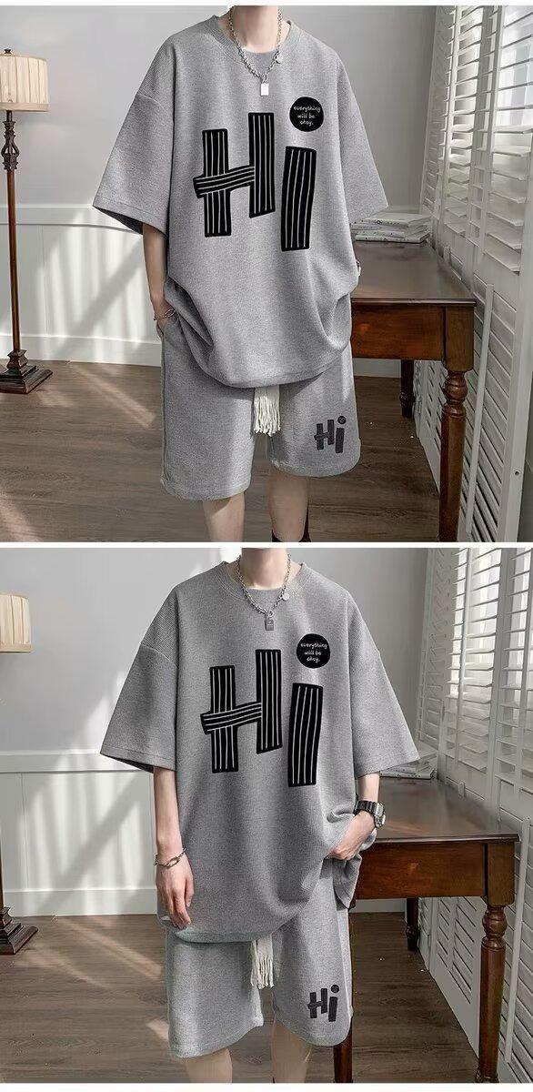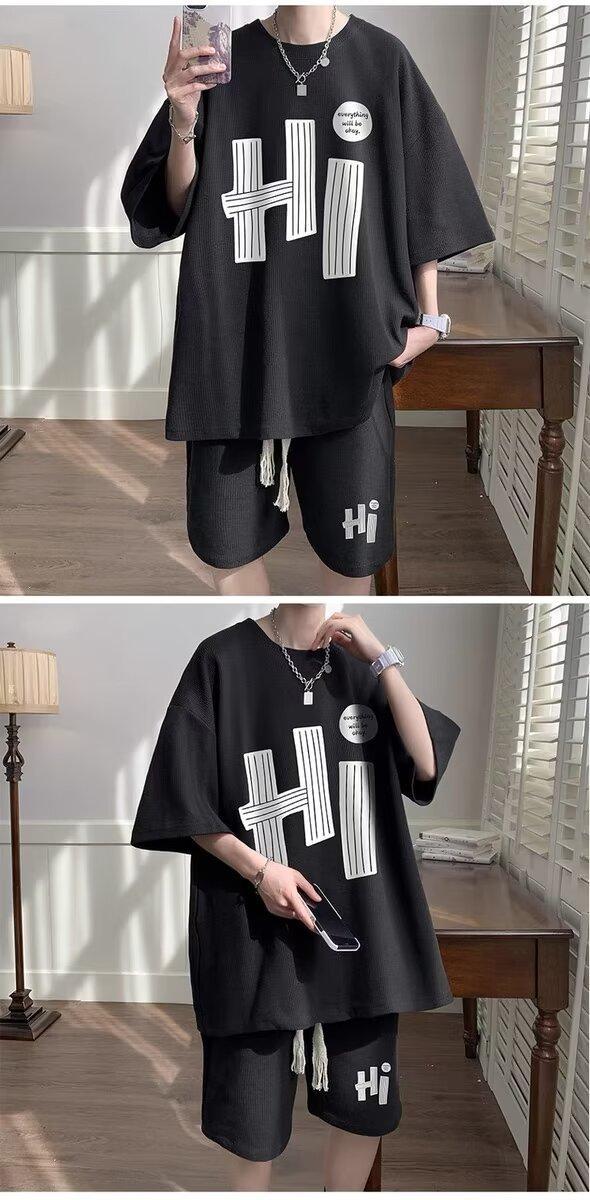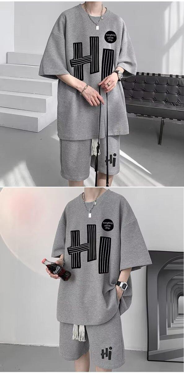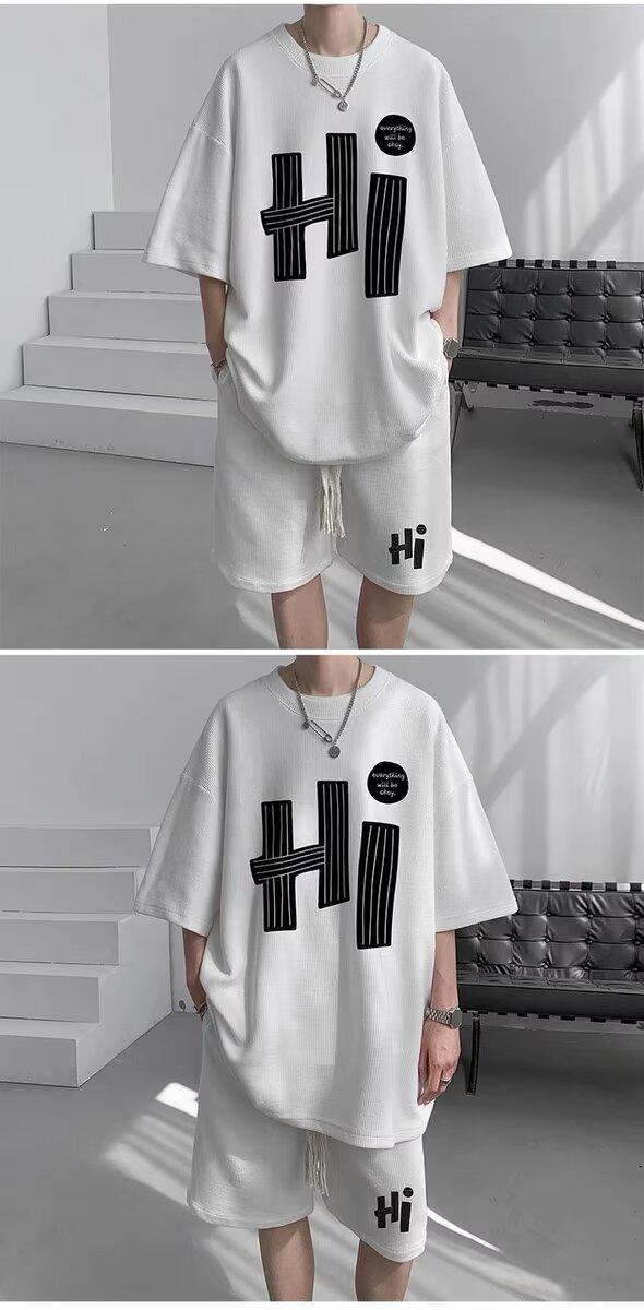 华夫格短袖套装男生潮牌夏季宽松休闲五分短裤运动搭配帅气一套装