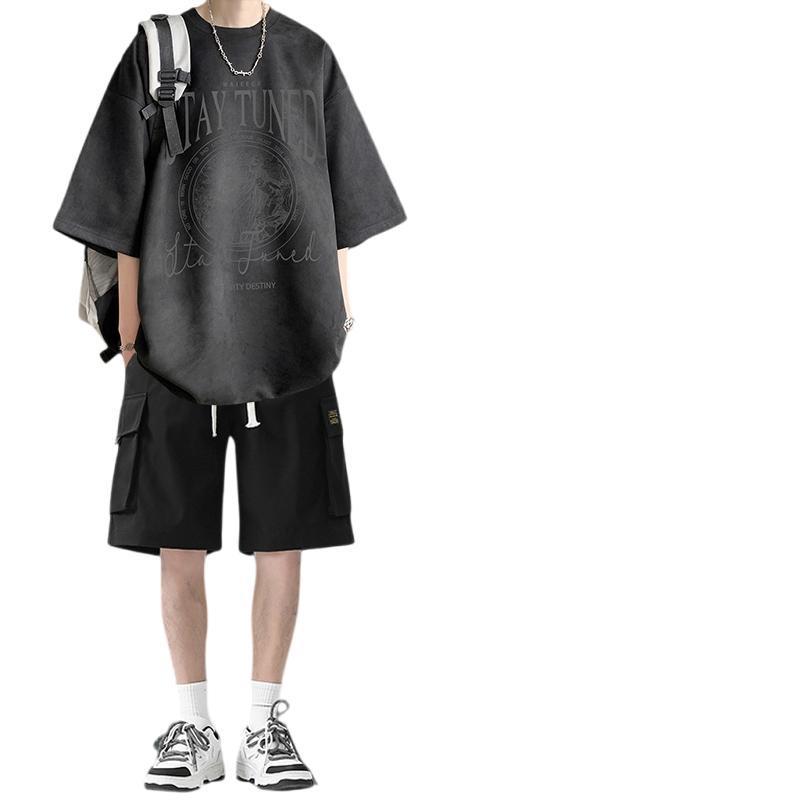 嘻哈套装男夏季高街时尚宽松休闲t恤潮牌hiphop美式短袖短裤2件套