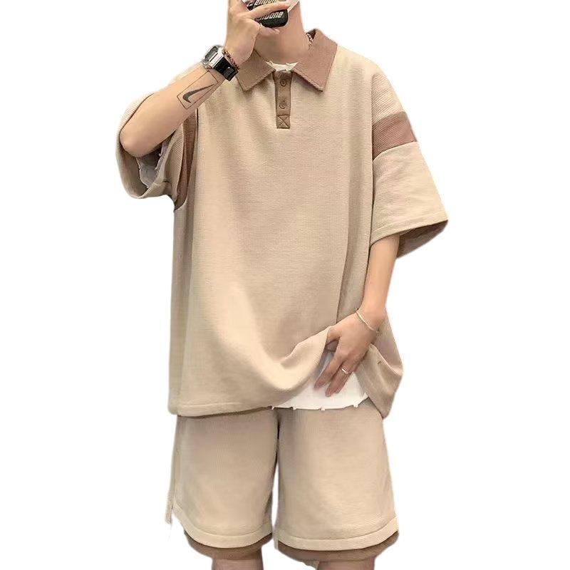 港风潮牌华夫格短袖POLO衫套装男生休闲时尚痞帅简约纯色两件套装