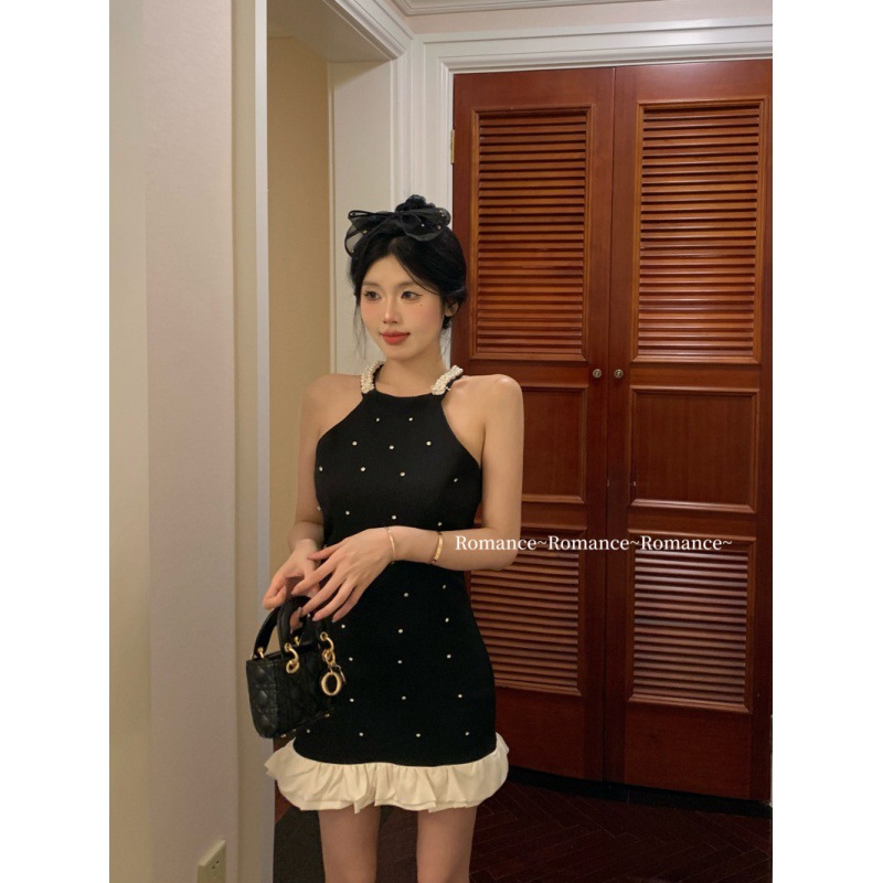 高级感法式挂脖无袖修身满天星A字裙木耳边重工镶钻背心连衣裙夏