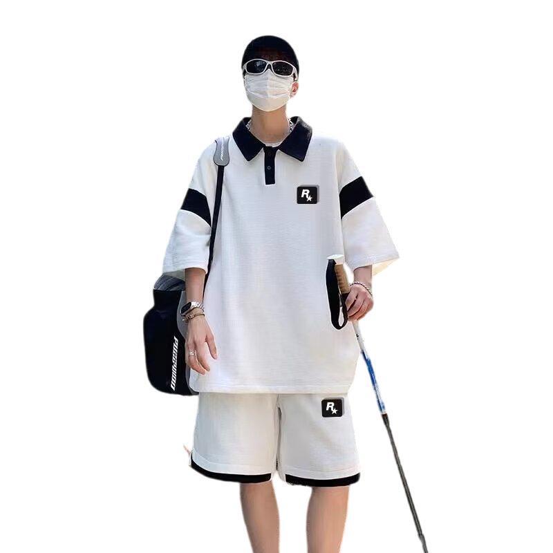 华夫格短袖POLO衫套装男生潮牌休闲衣服夏季新款拼色痞帅两件套装
