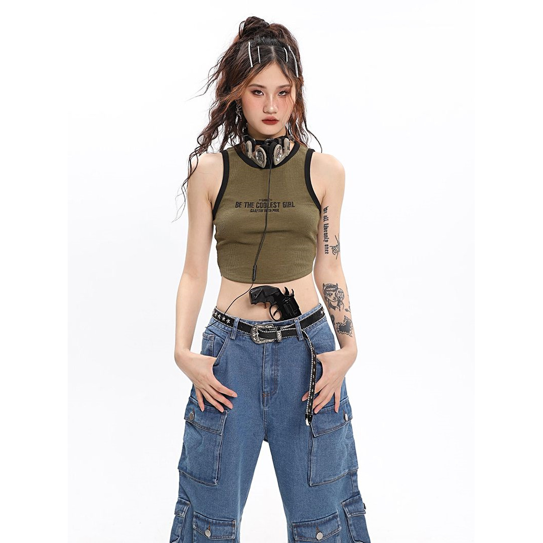 2025年新款上衣军绿拼色刺绣字母美式短款工字背心