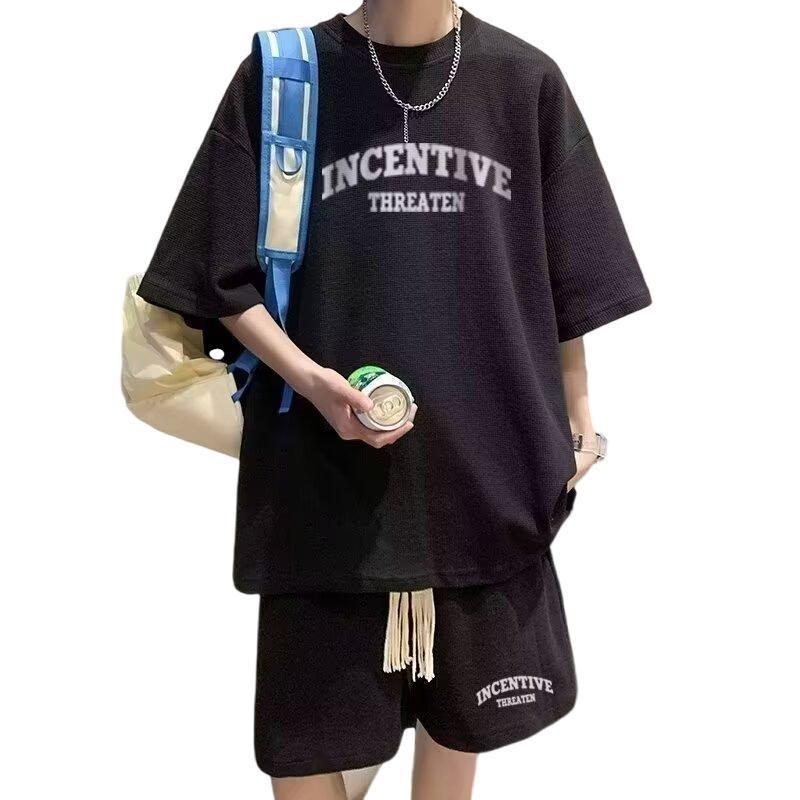 休闲时尚套装男生华夫格运动oversize短袖短裤设计感痞帅两件套装
