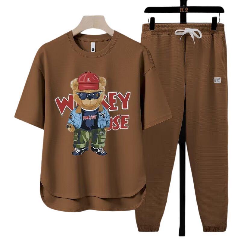 夏季新款华夫格休闲套装男短袖T恤九分裤宽松百搭小熊印花一整套