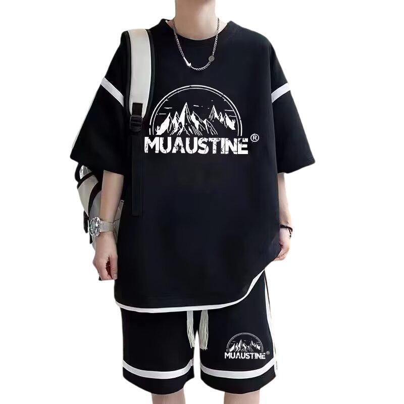 华夫格短袖套装男生潮牌夏季新款休闲五分裤时尚痞帅运动搭配套装