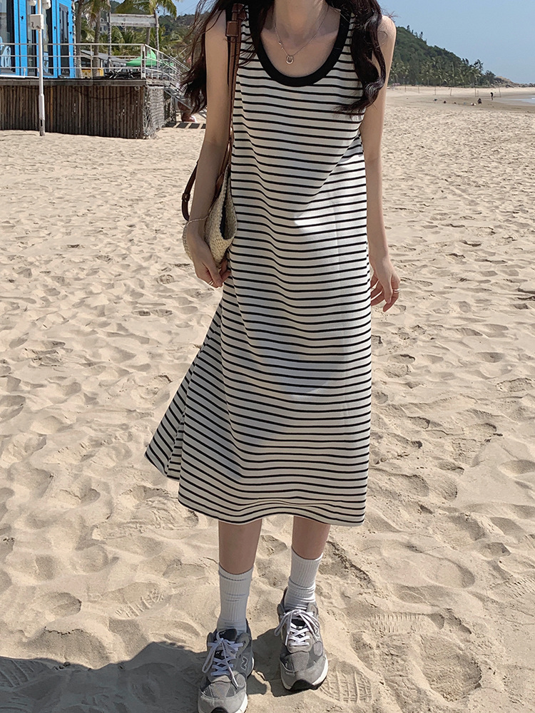 夏季新款条纹吊带背心连衣裙女胖MM外穿打底长裙欧美宽松大码裙子