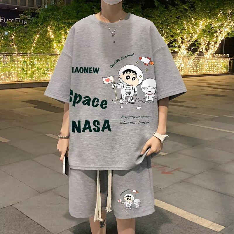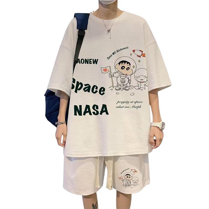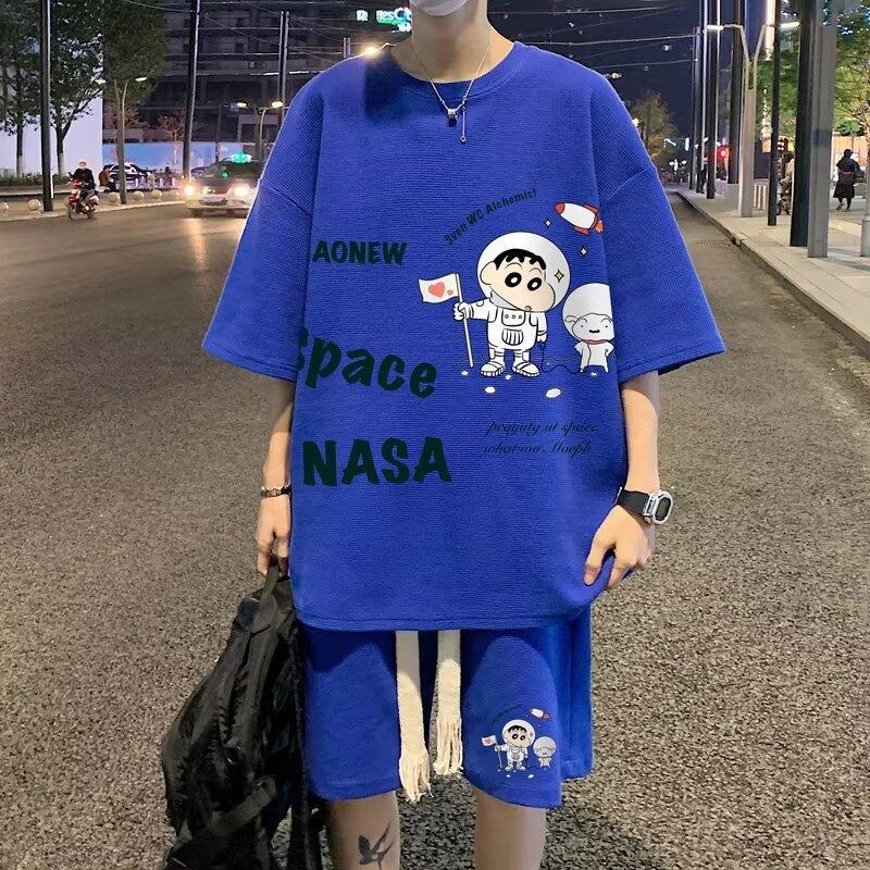 华夫格休闲运动套装男生夏季新款宽松蜡笔小新短袖t恤短裤两件套