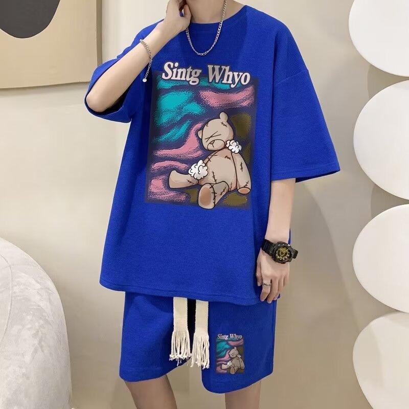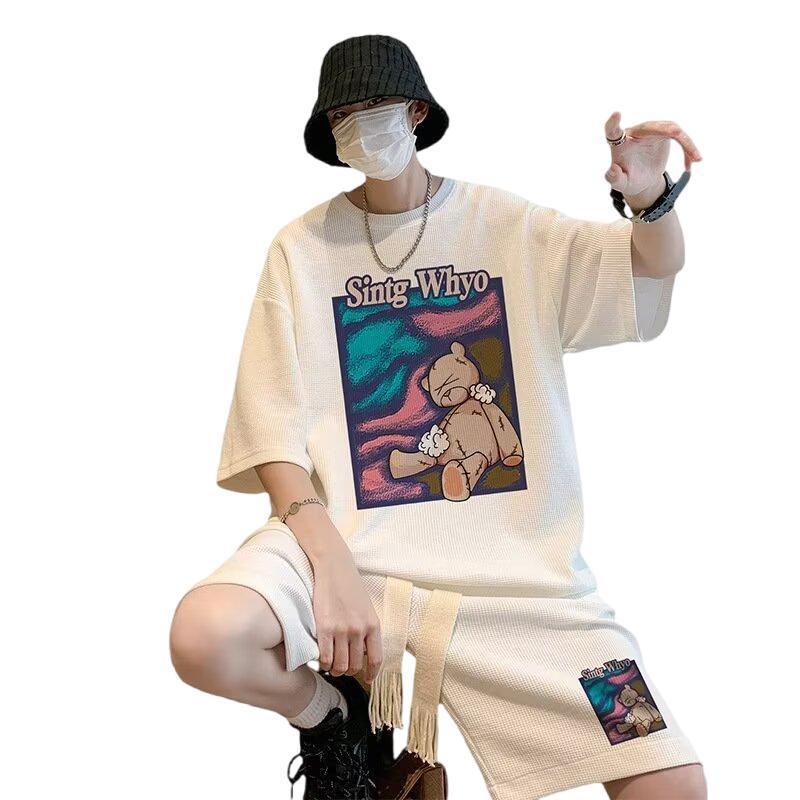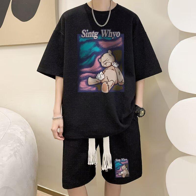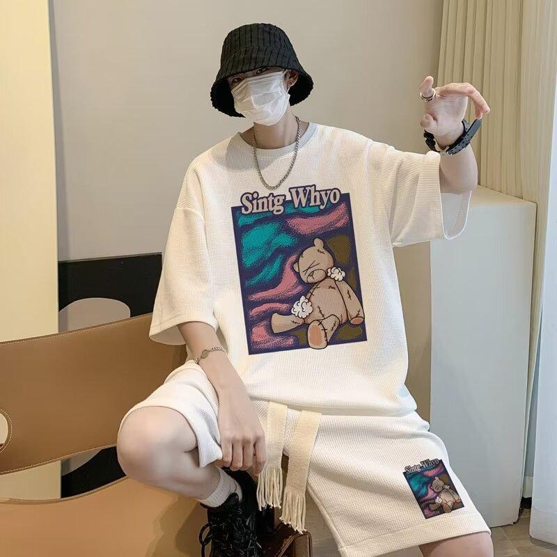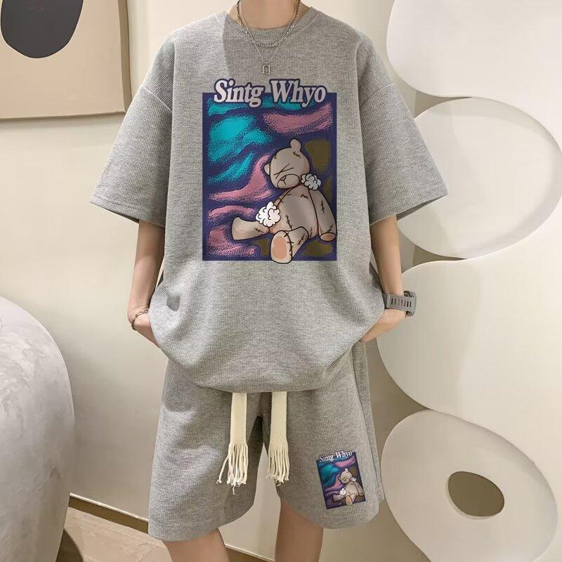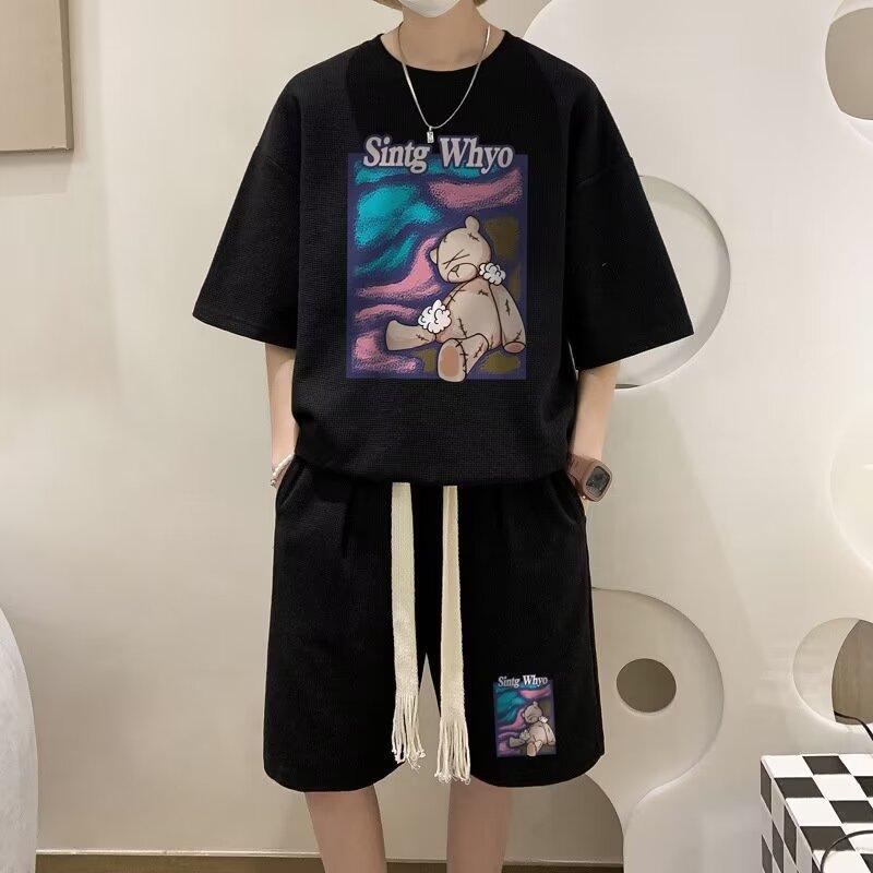 小熊华夫格运动套装男夏季新款港风高级感痞帅青少年休闲短袖短裤