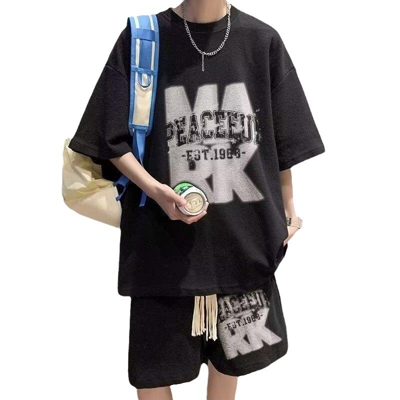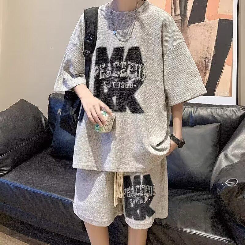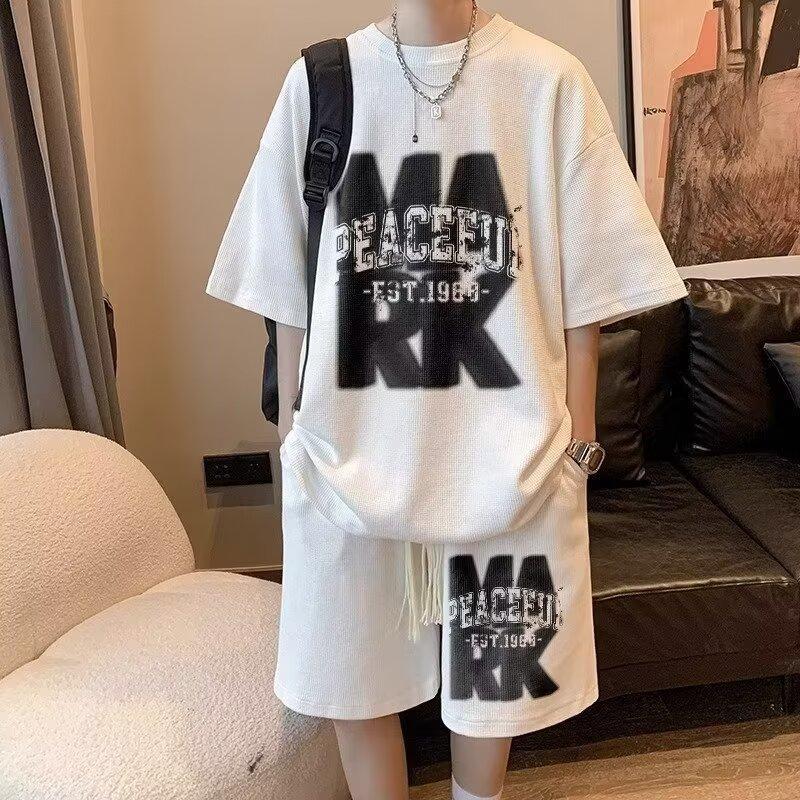 华夫格美式t恤男夏季oversize大码宽松半袖体恤休闲套装nis短裤男