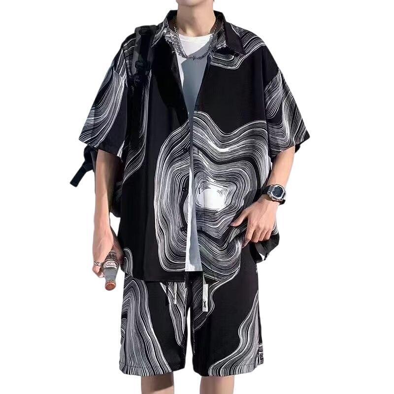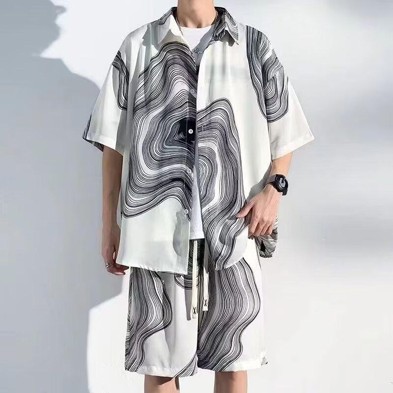 时尚休闲风男生衬衫冰丝套装夏季透气痞帅扎染宽松短袖短裤一整套