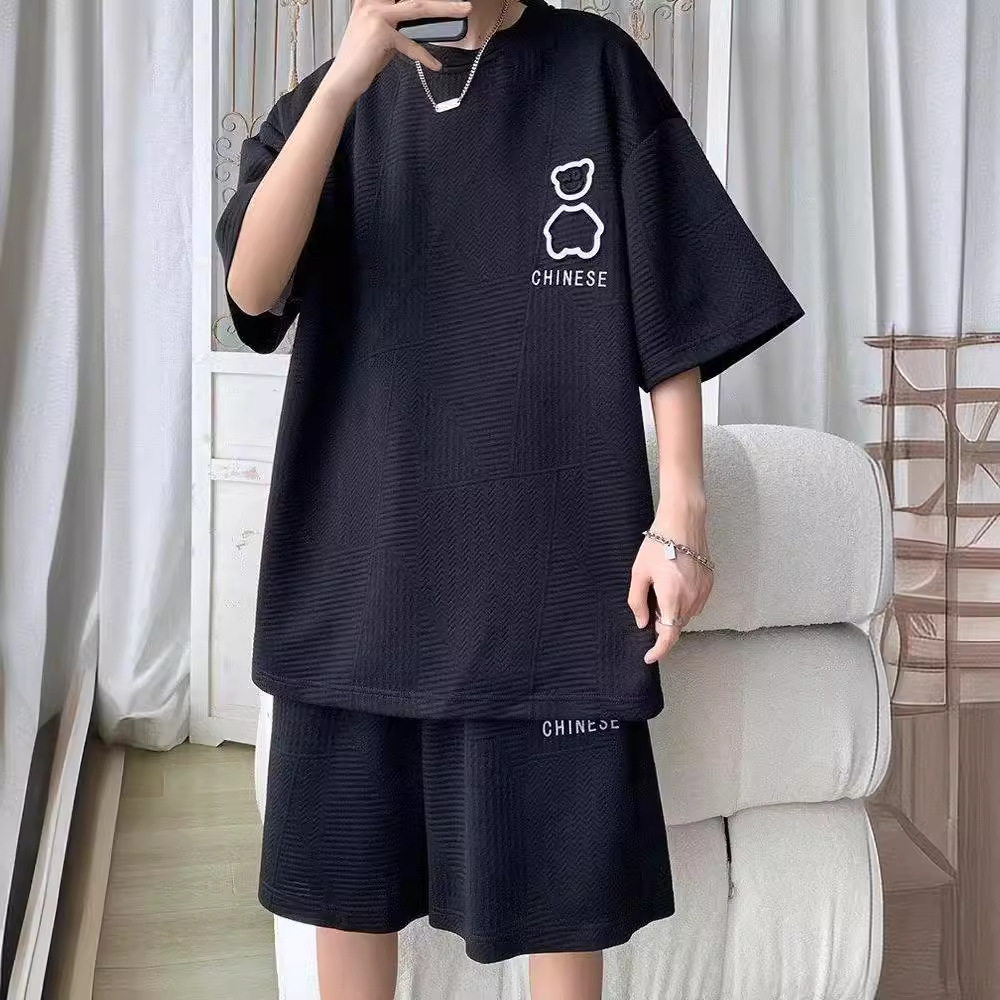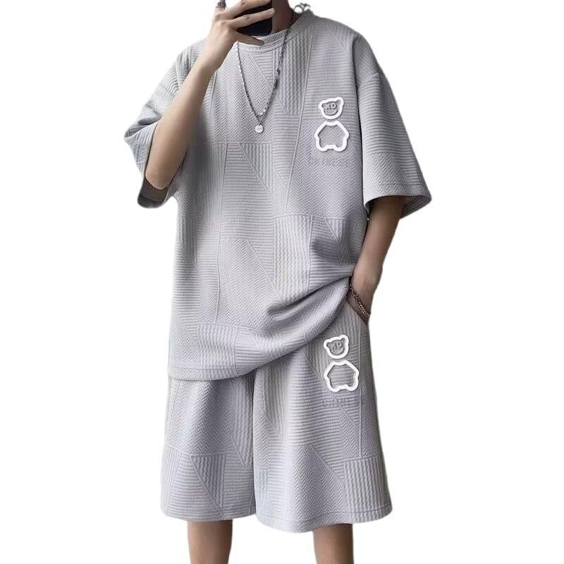 小熊t恤男士夏季潮牌宽松短袖短裤篮球服一套华夫格运动套装