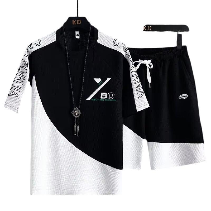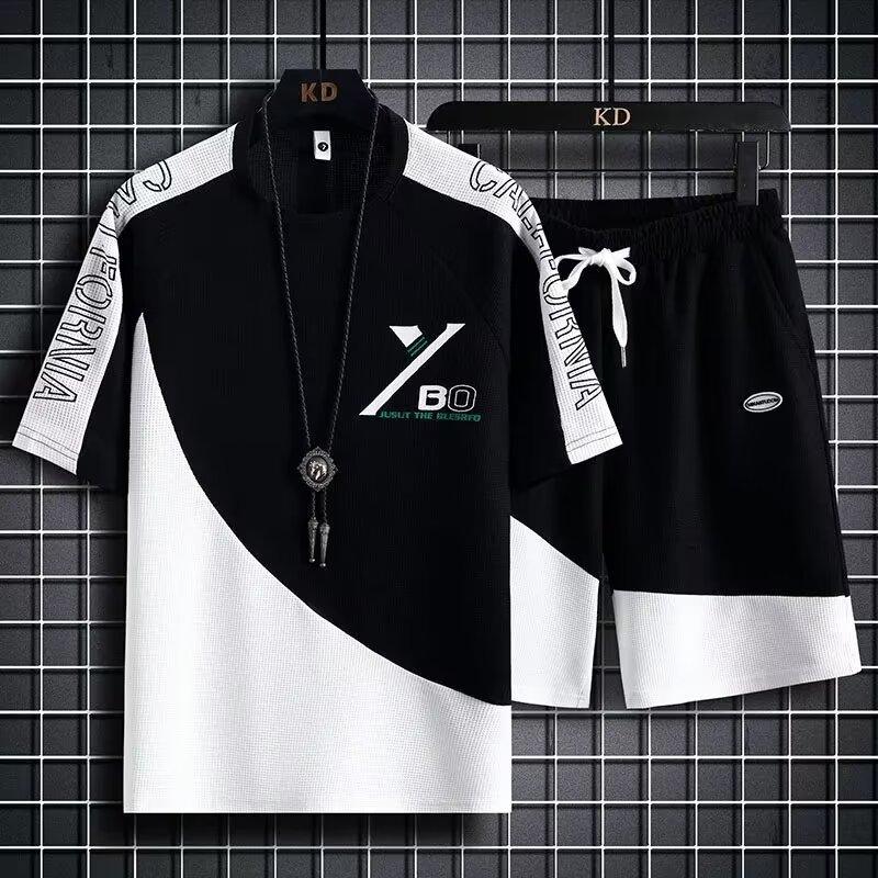 华夫格休闲套装男夏季新款潮牌港风宽松高级感短袖短裤运动两件套