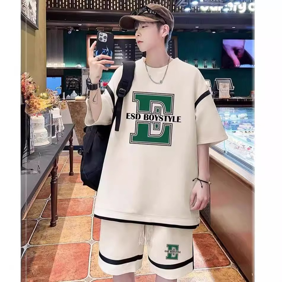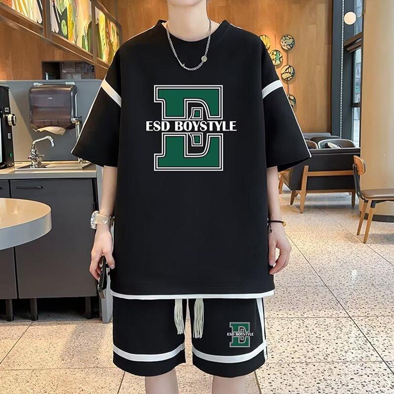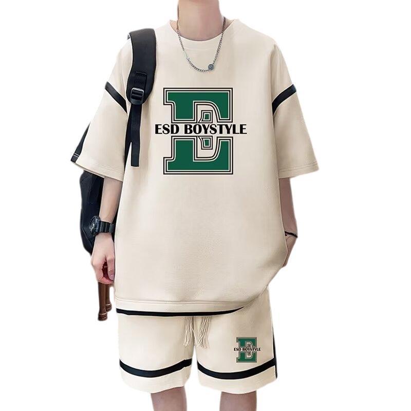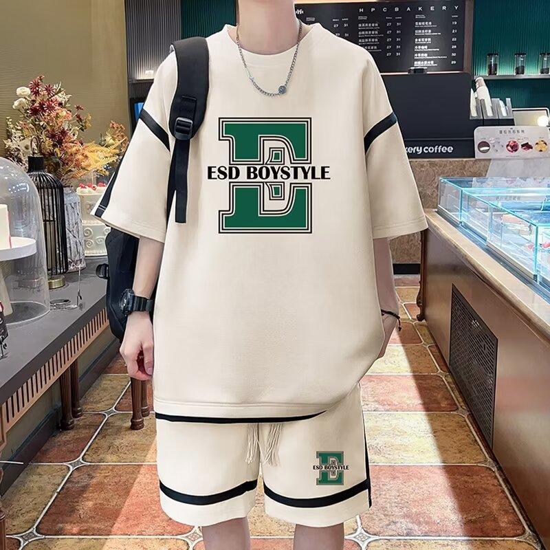 休闲运动套装男生夏季新款华夫格潮牌圆领半袖体恤衫短裤两件套装