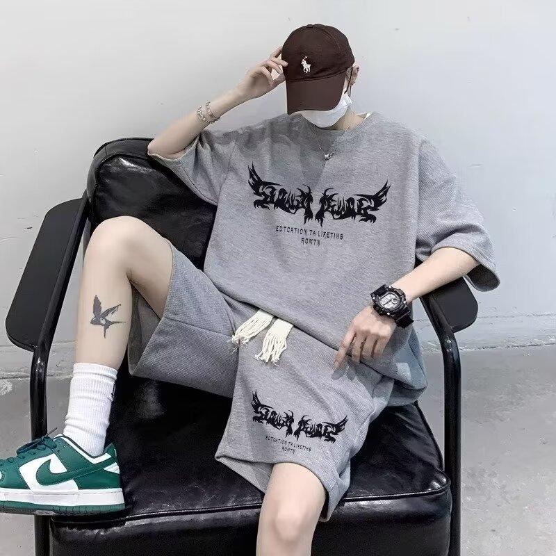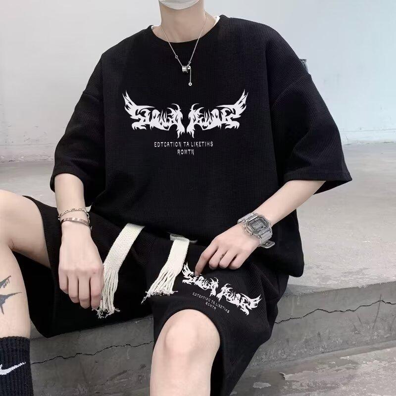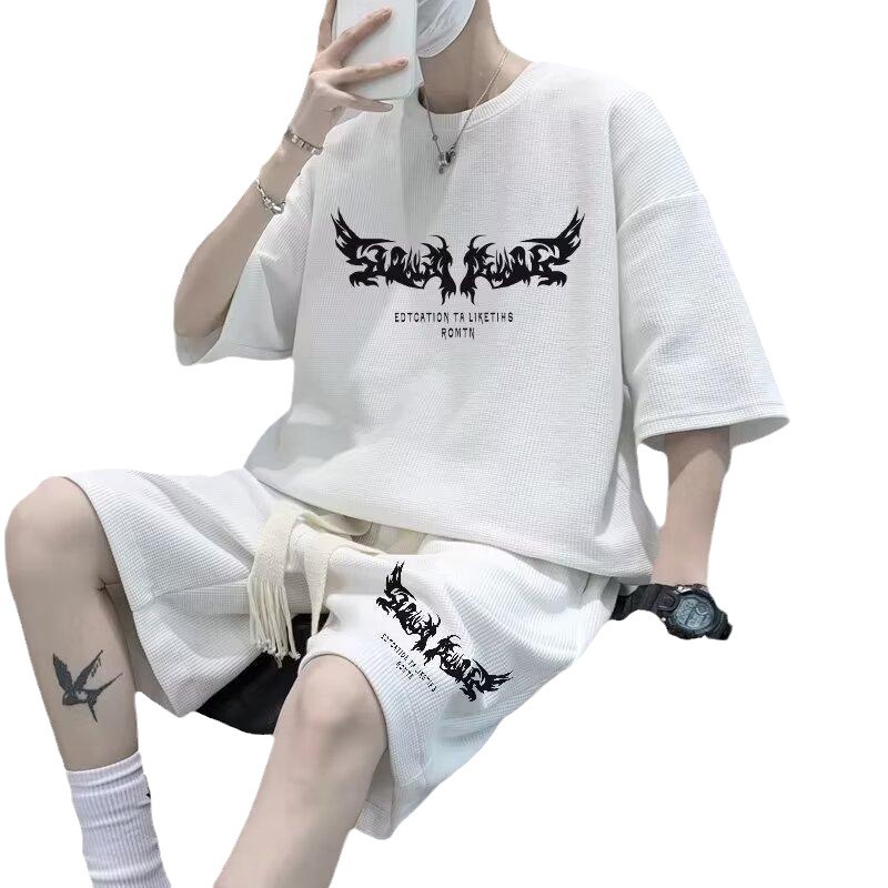 华夫格潮牌短袖T恤套装男款夏季美式短袖短裤两件套休闲运动搭配