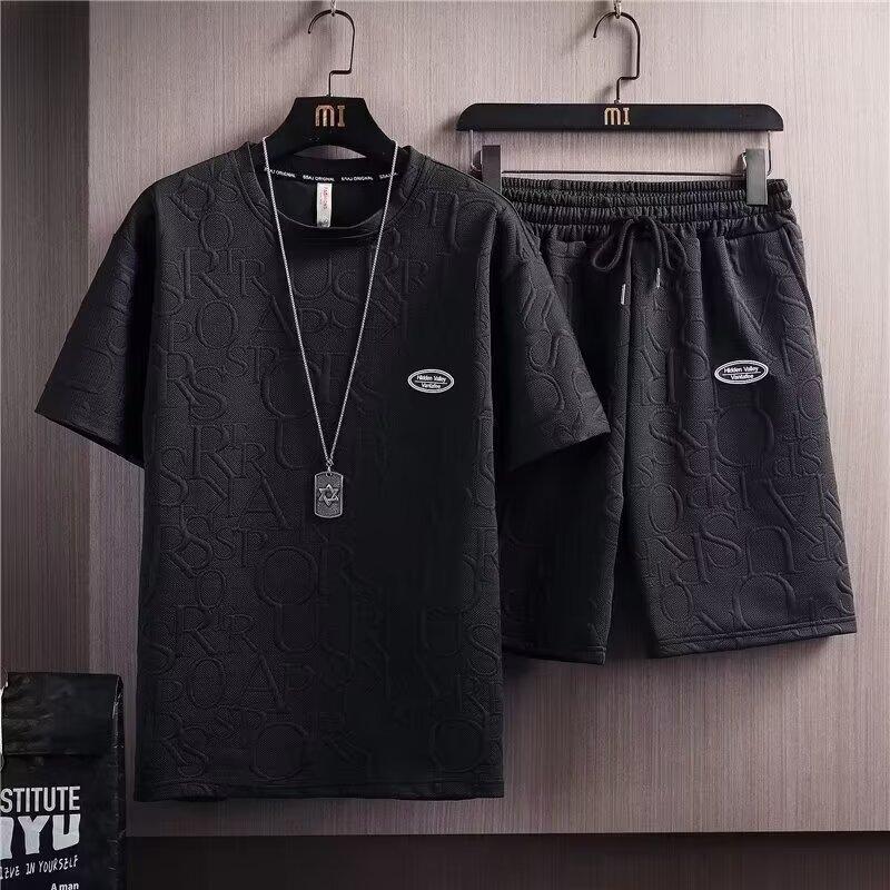 运动套装男夏季新款高级感华夫格t恤短裤两件套宽松休闲时尚套装