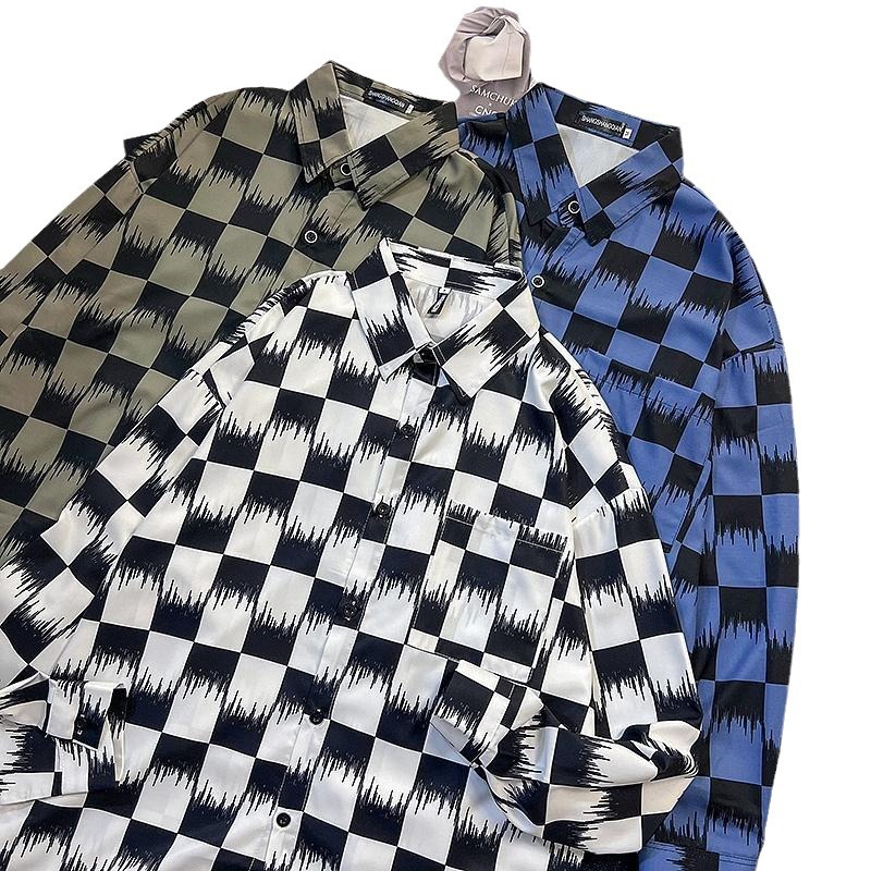 棋盘格衬衫男潮春季美式暗黑系潮流黑白格纹衬衣潮嘻哈休闲外套男
