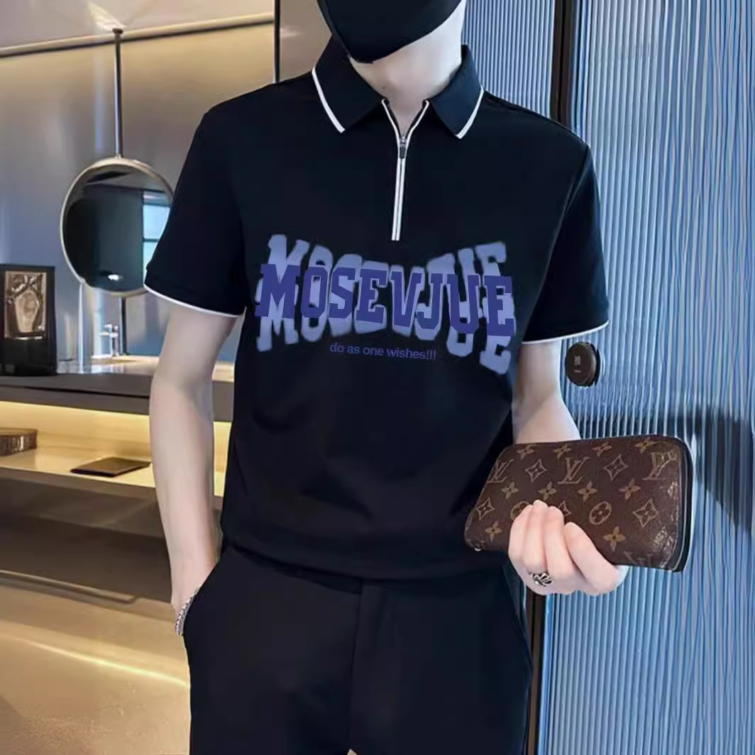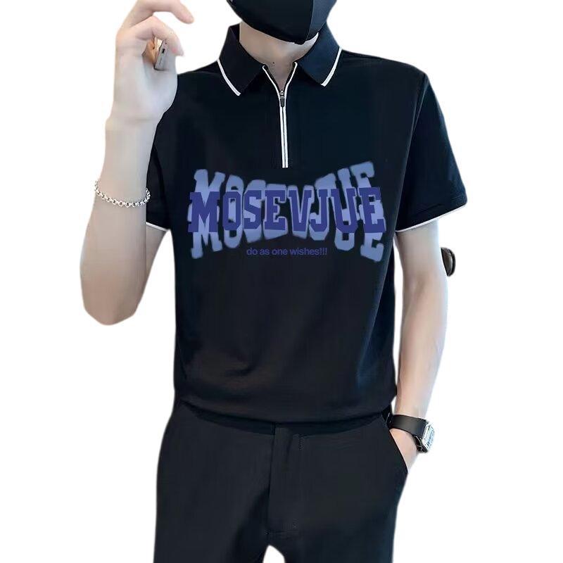 美式复古POLO衫男生夏季新款字母虚影印花半拉链痞帅青少年上衣服