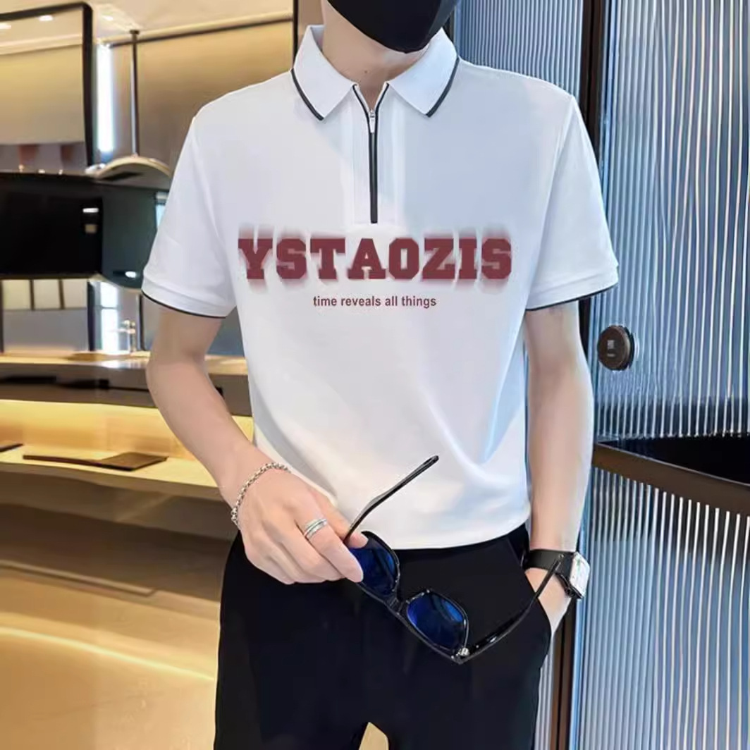 美式半拉链短袖t恤男夏季新款潮牌字母印花Polo衫宽松时尚体恤衫