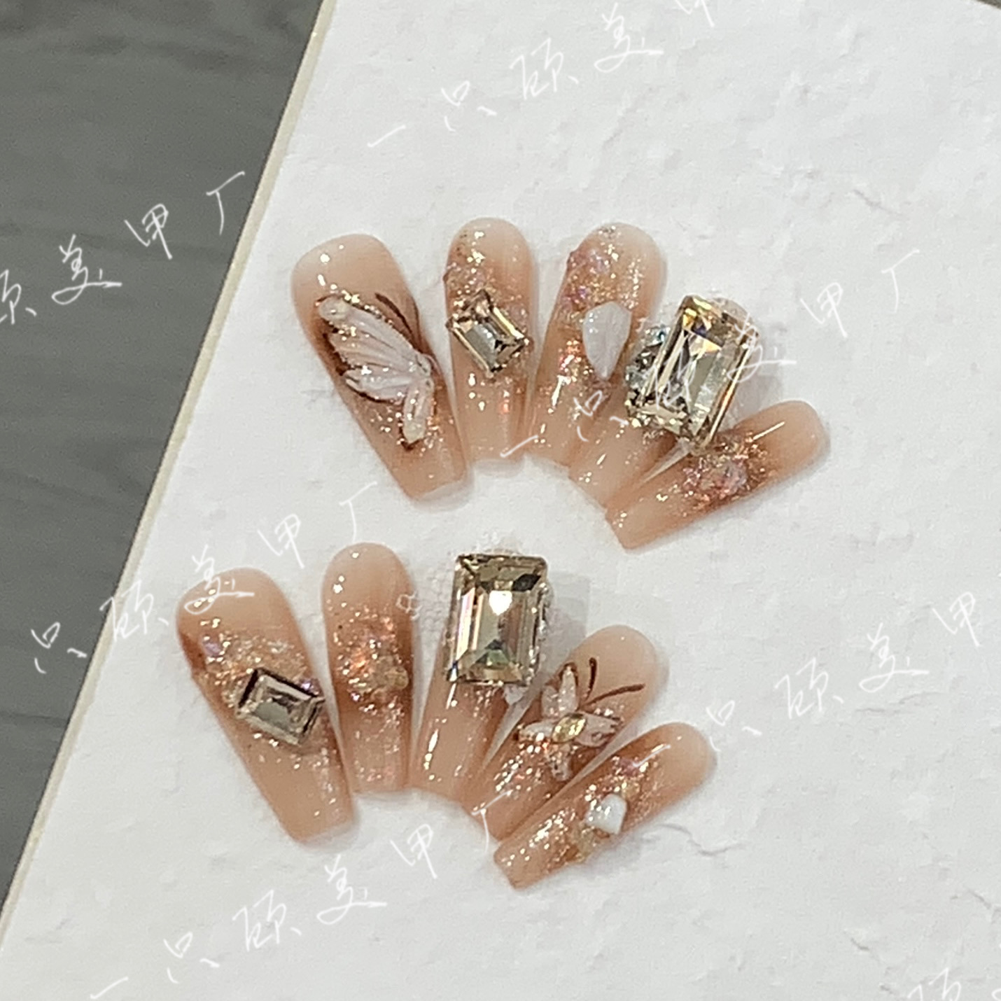 一只顾美甲厂【Y】手绘浮雕蝴蝶蕾丝贝壳石K9钻枯叶蝶指甲