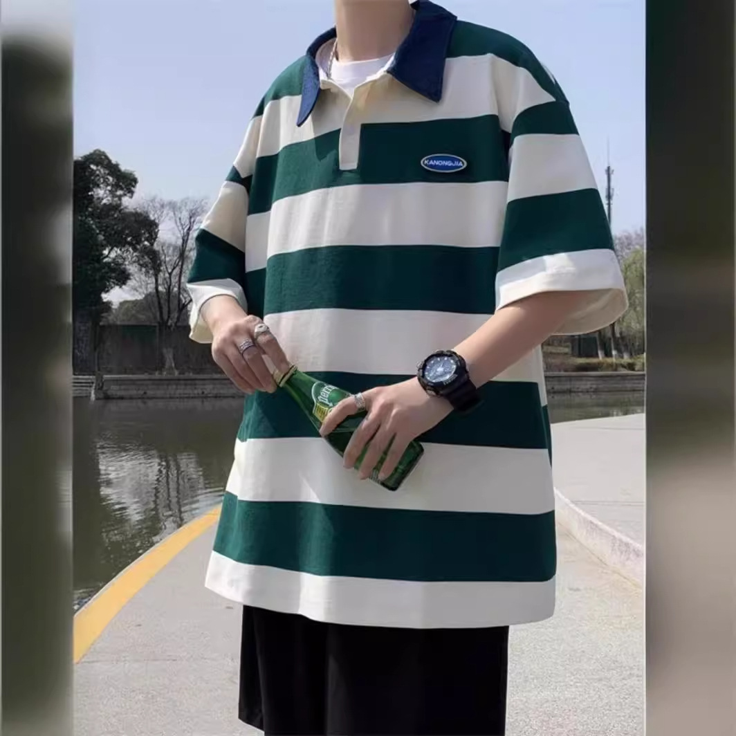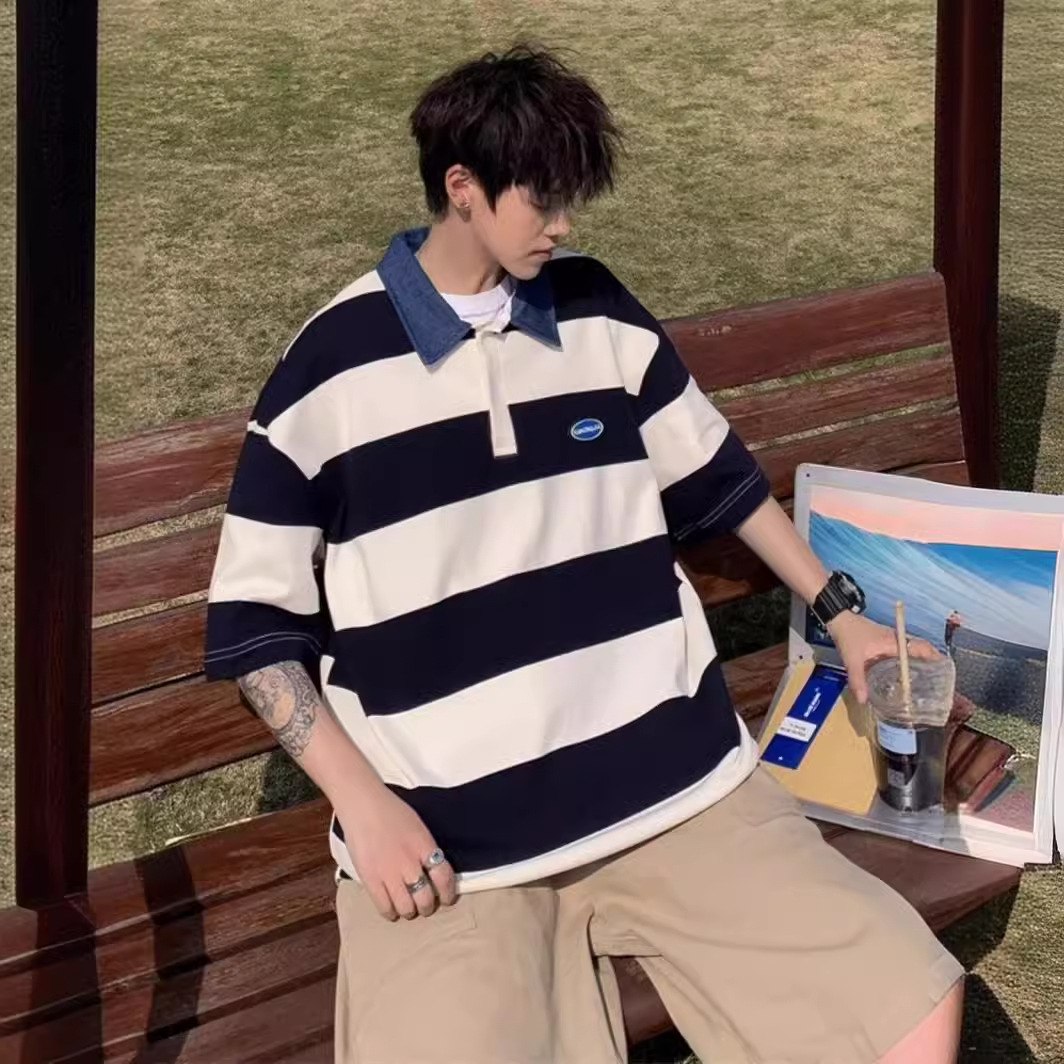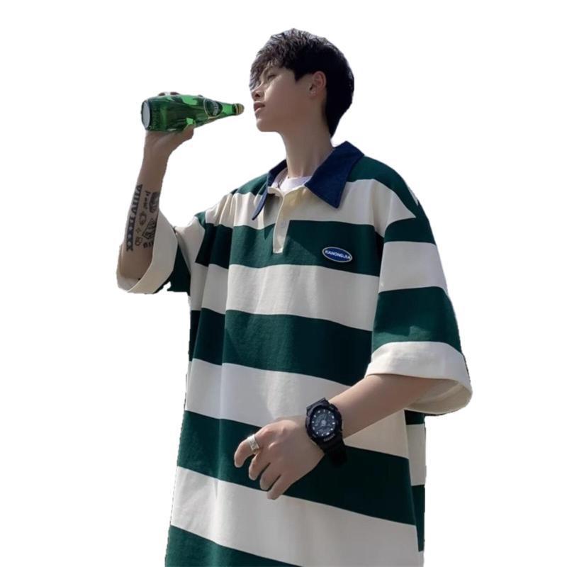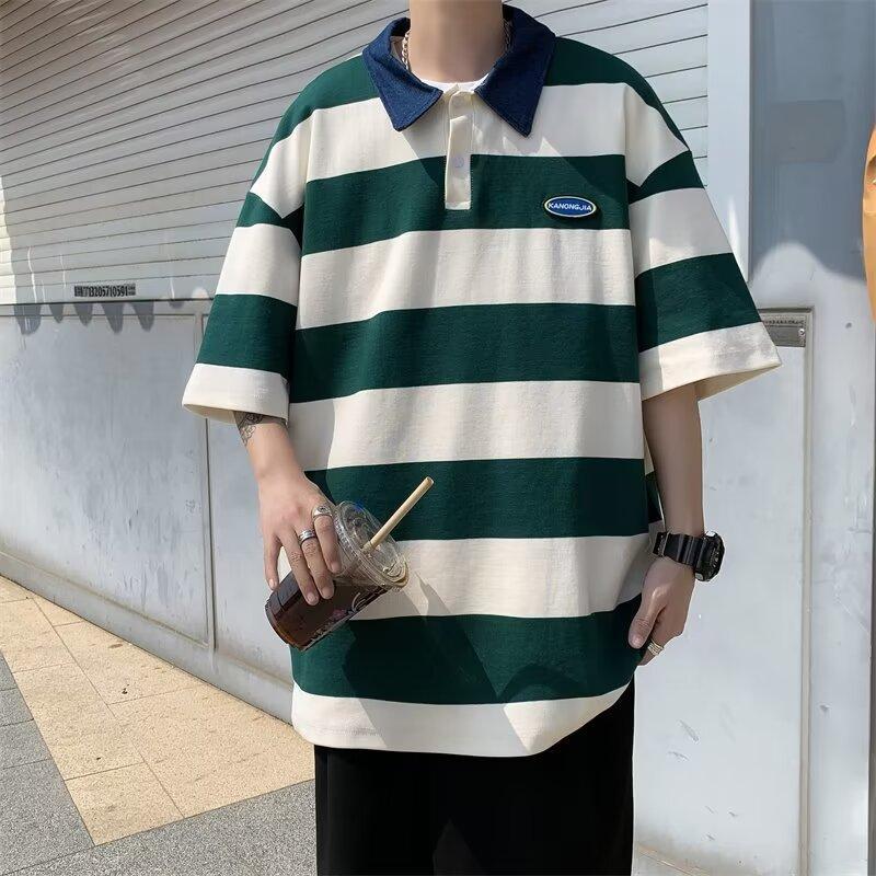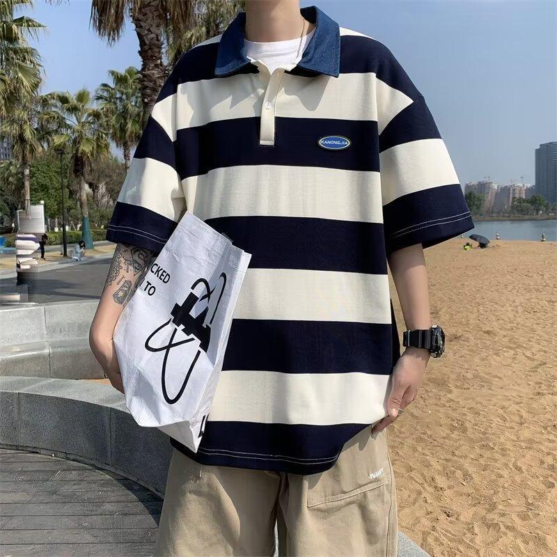 港风日系纯棉重磅条纹polo衫男生夏季美式痞帅潮牌翻领短袖T恤衫