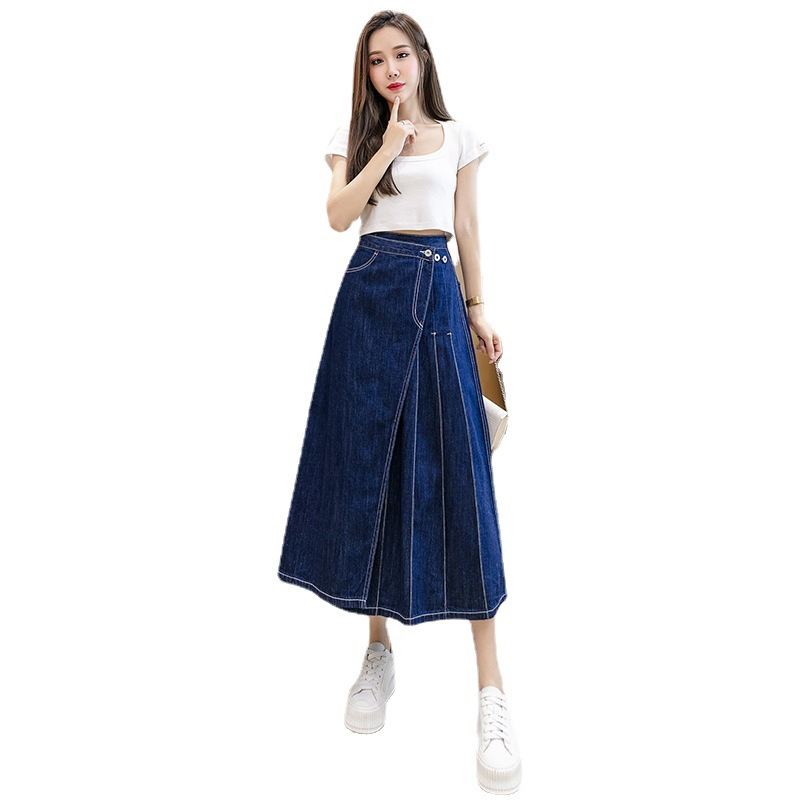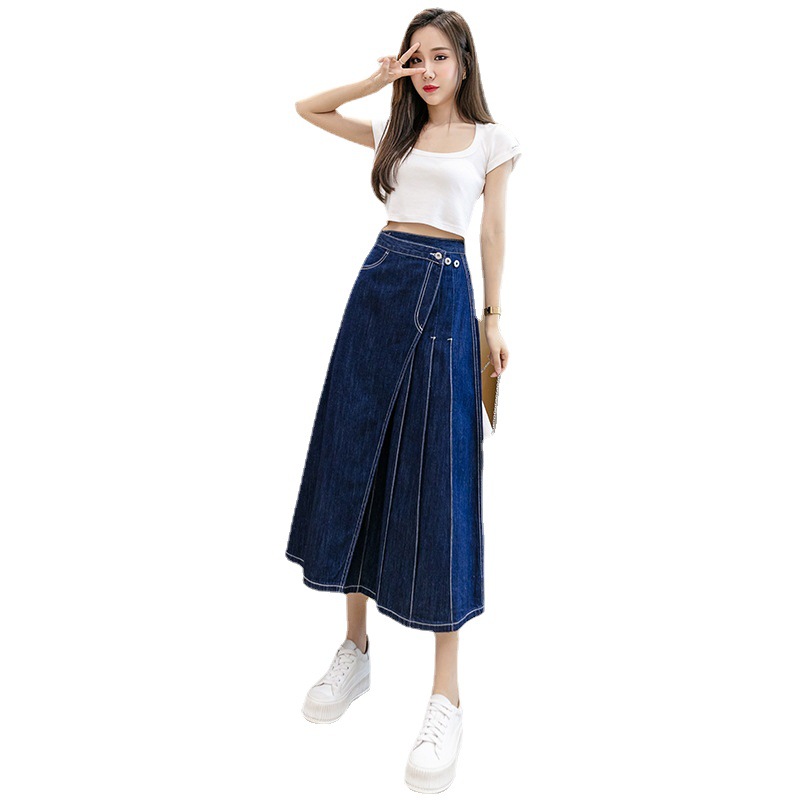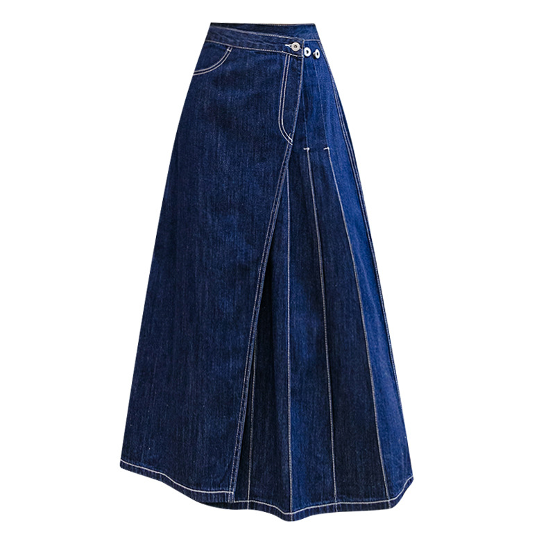 牛仔半身裙女中长款春秋款不规则设计感百褶裙牛仔中长裙