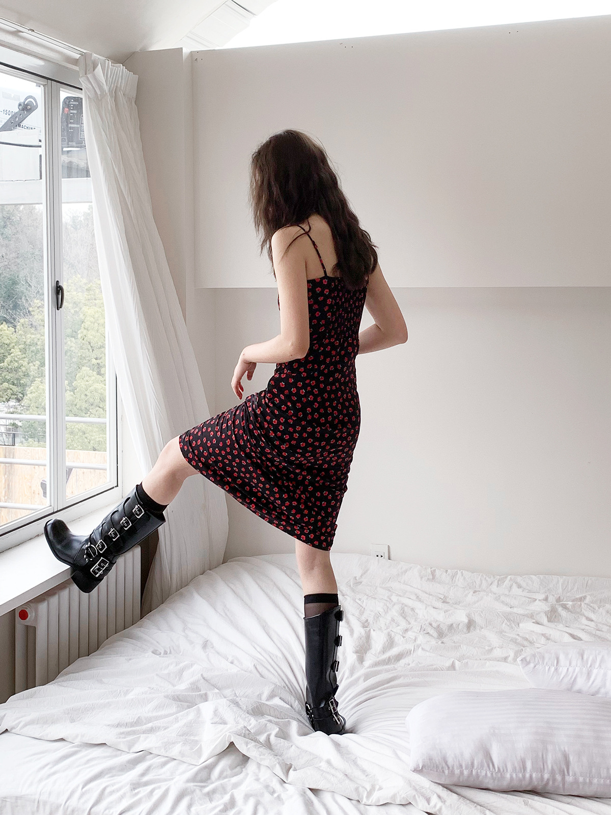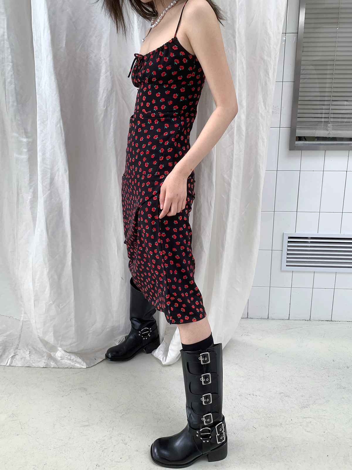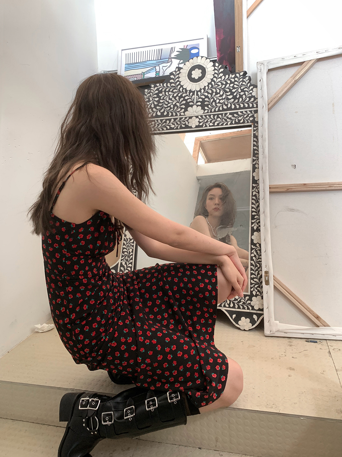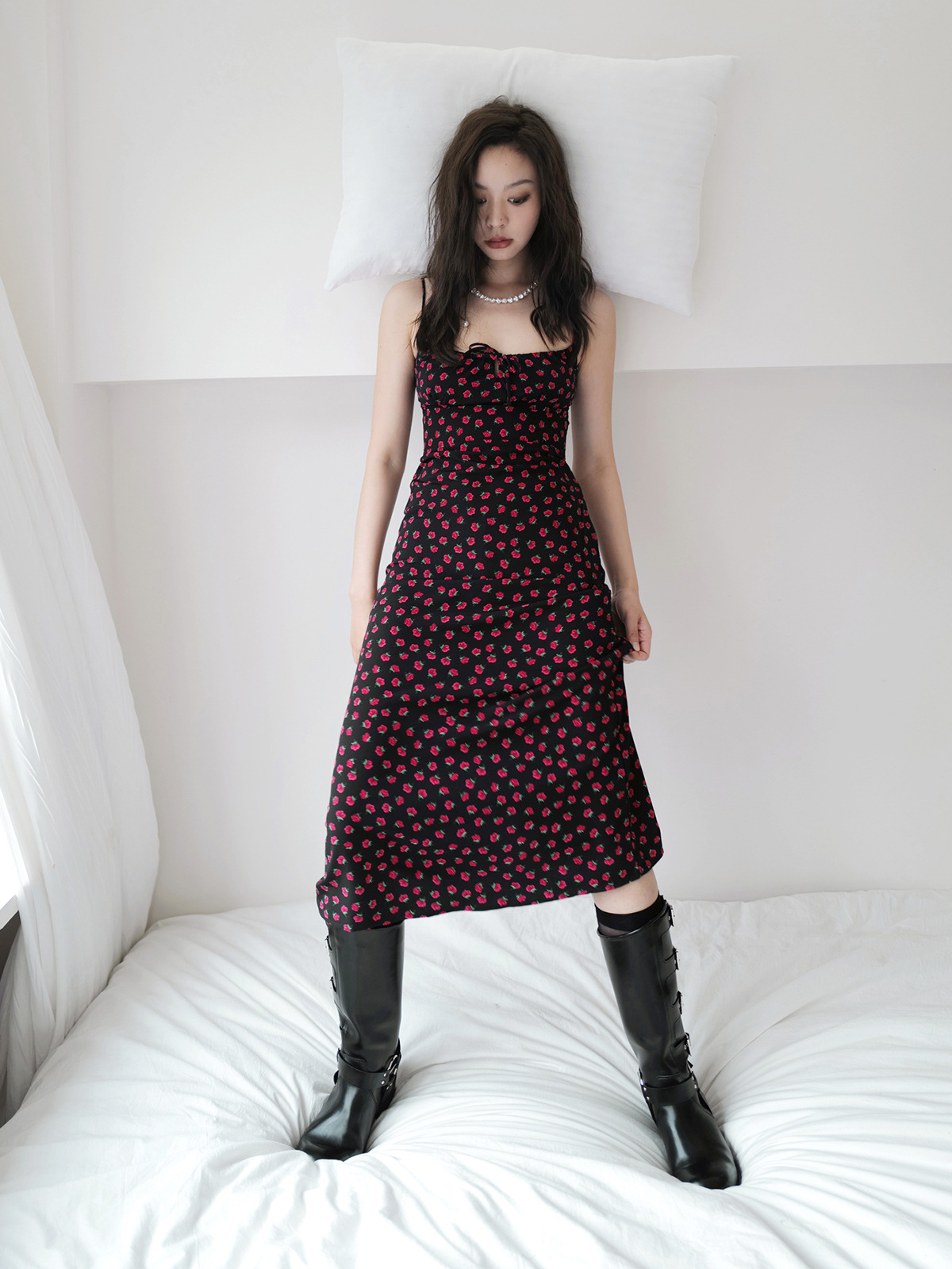 夏季新品玫瑰印花吊带裙小碎花系带松紧无袖连衣裙长款