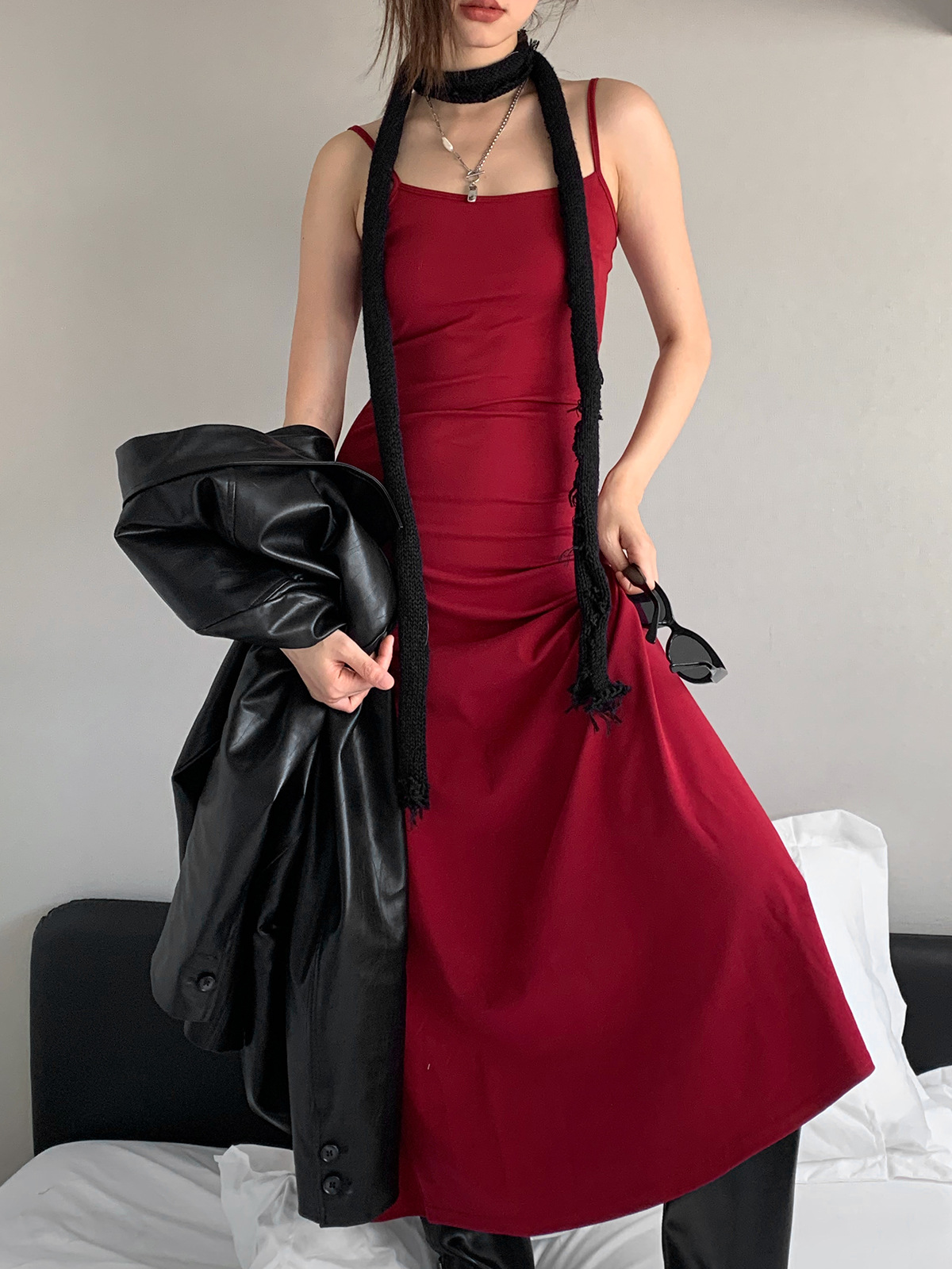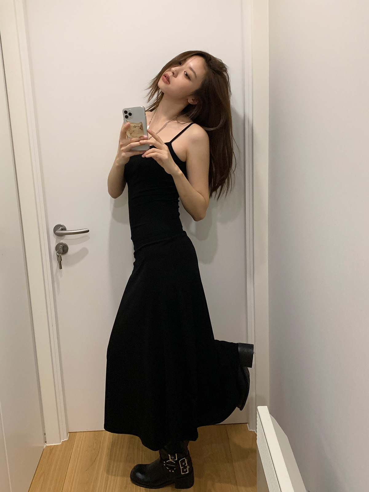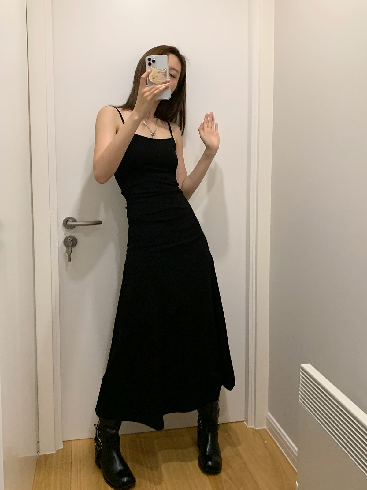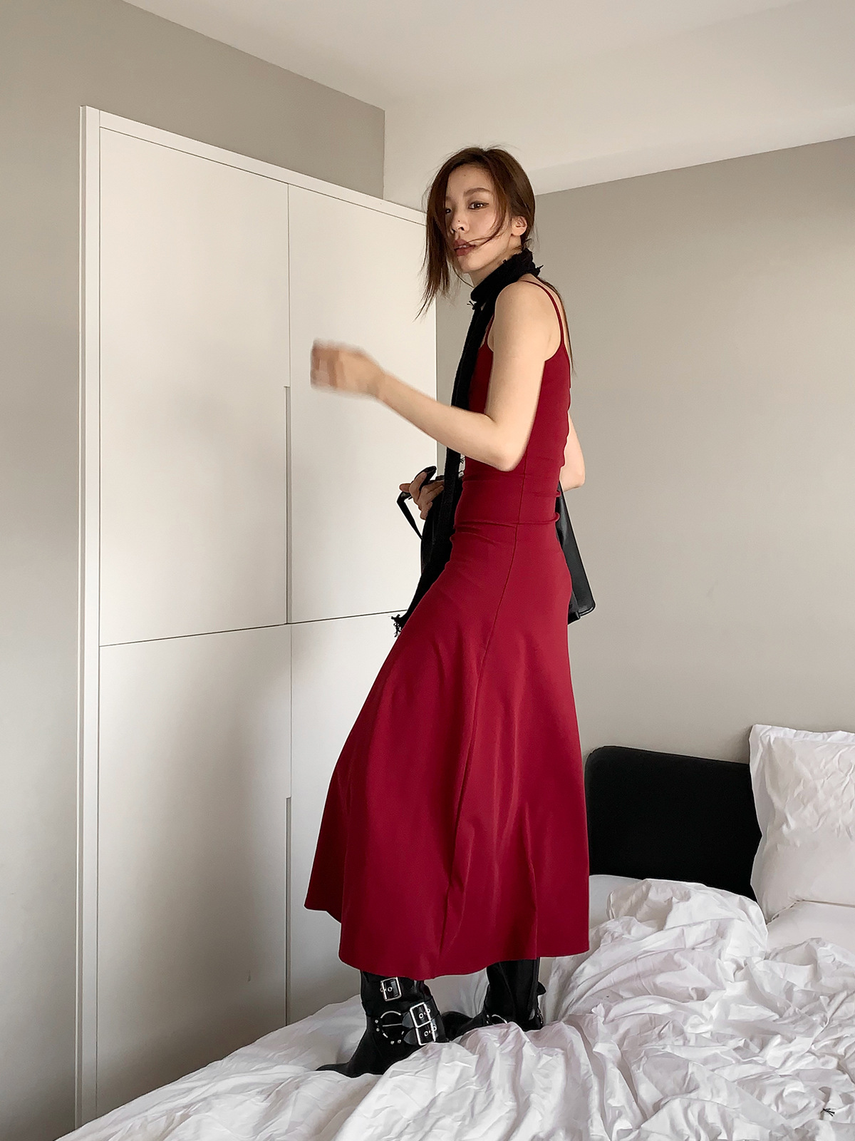 夏季休闲度假风纯色大摆修身长裙吊带一字领连衣裙